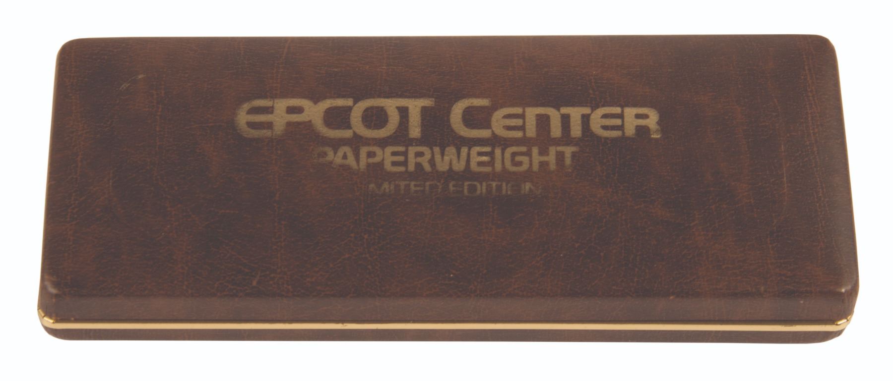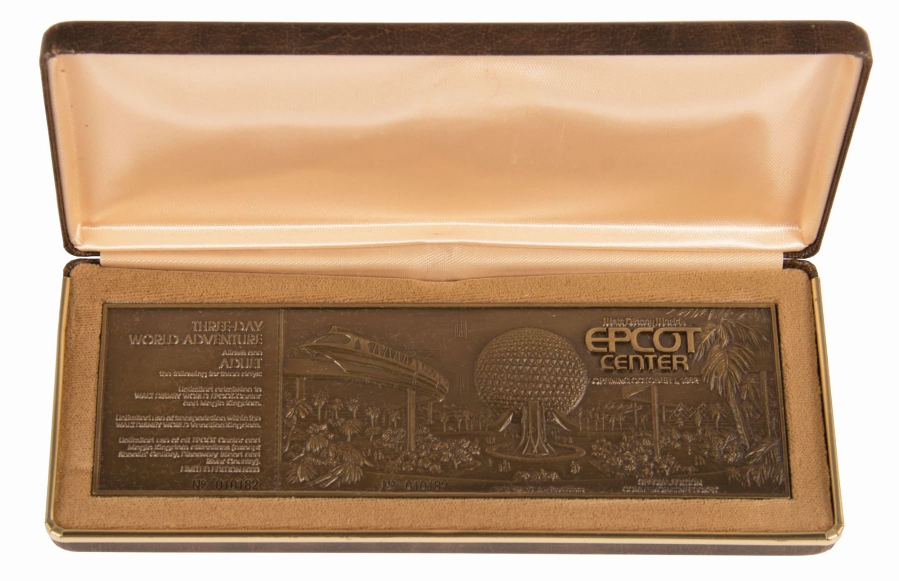 (Epcot, 1982) A very rare limited edition bronze paperweight created to celebrate the grand opening of Epcot. This paperweight was created to resemble an Epcot ticket, and is numbered 010182 in reference to the opening of Epcot on Oct 1, 1982. The paperweight comes in its original clamshell case. Measuring 2"x5.75", the paperweight is in very good condition with minor wear.