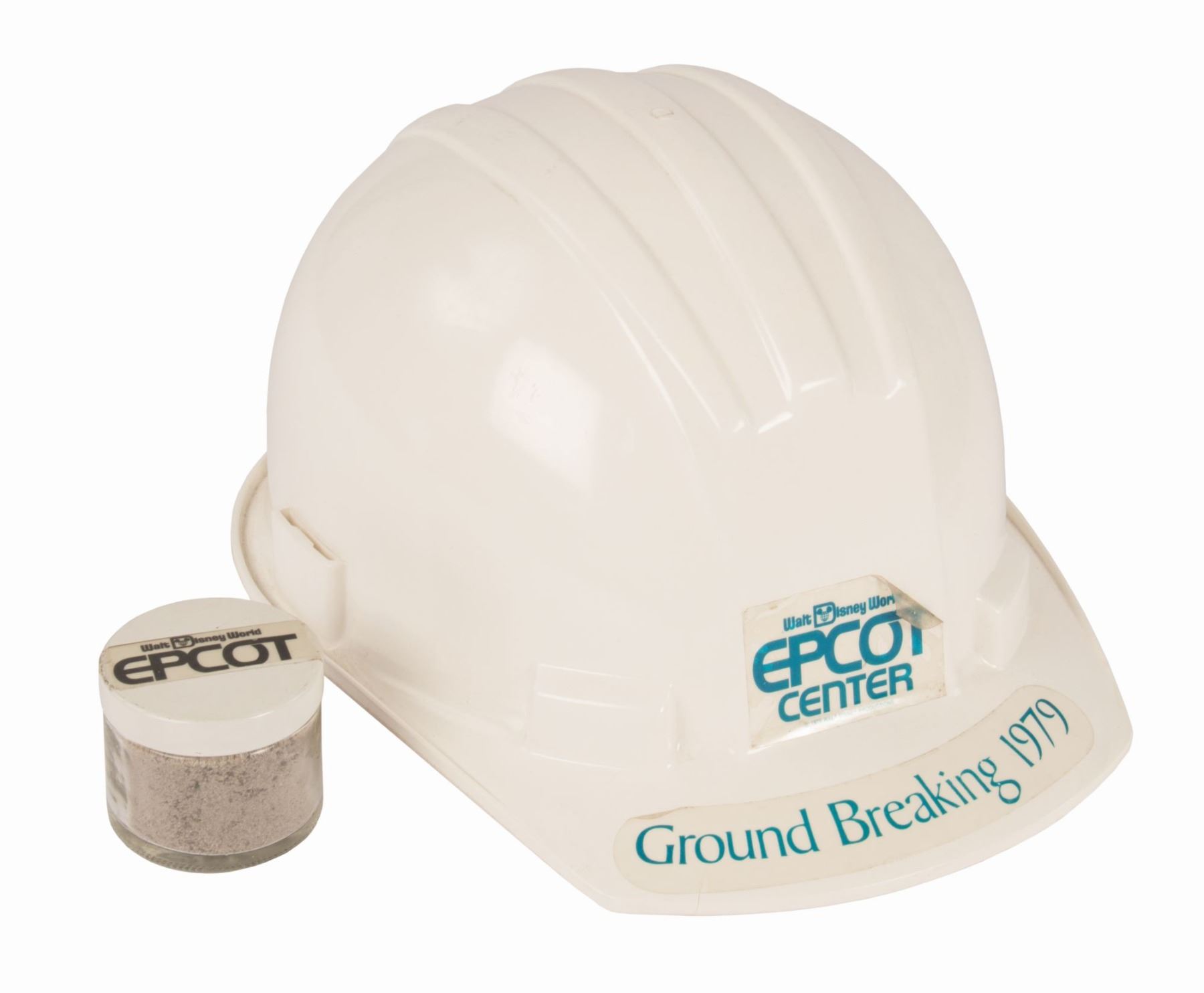 (Epcot, 1979) A very rare original hardhat and jar of commemorative dirt from the groundbreaking events for Epcot Center. The groundbreaking event was held on October 1, 1979 and this hardhat has project labels relating to the event. The hard hat is adjustable for size, and the jar measures 2.25" in diameter and 2" tall. The condition is good overall, with some surface wear to the hardhat including a lifting corner to the Epcot sticker, and some surface wear to the jar. There are a couple small breaks to the inner hardhat straps.