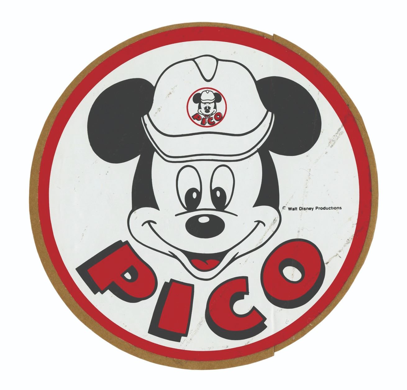 (Epcot, 1980s) An original project sticker from the Project Installation Coordination Office (PICO) that was created for an Epcot construction project. Featuring a great image of Mickey wearing a PICO hard hat, the sticker measures 3.75" in diameter and is in very good unused condition with a few surface marks.