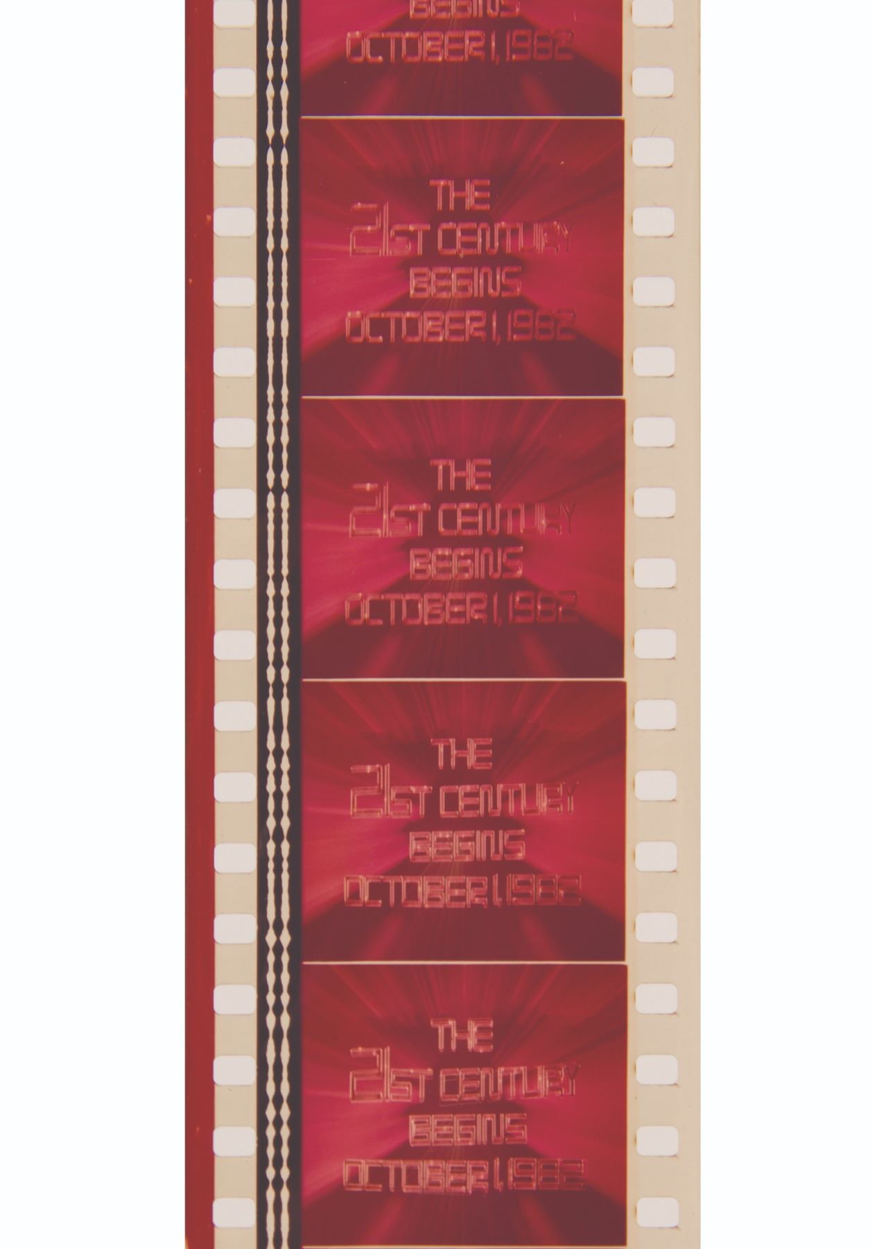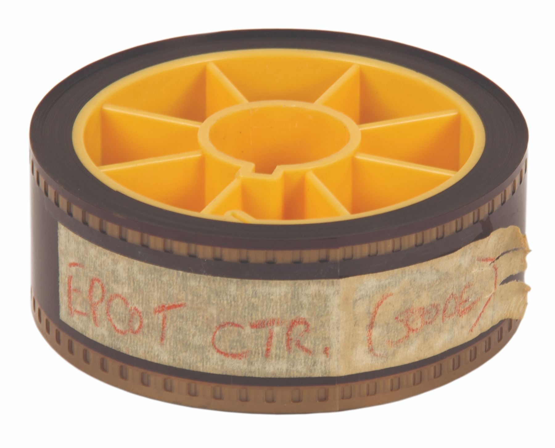 (Epcot, c.1982) A rare 35mm film trailer created to promote the opening of Epcot Center. The short footage has great vintage 1980s graphics that spell out "The Future Begins October 1, 1982" followed by the Epcot logo. The film is in good condition, with a reddish tint to the color from age.