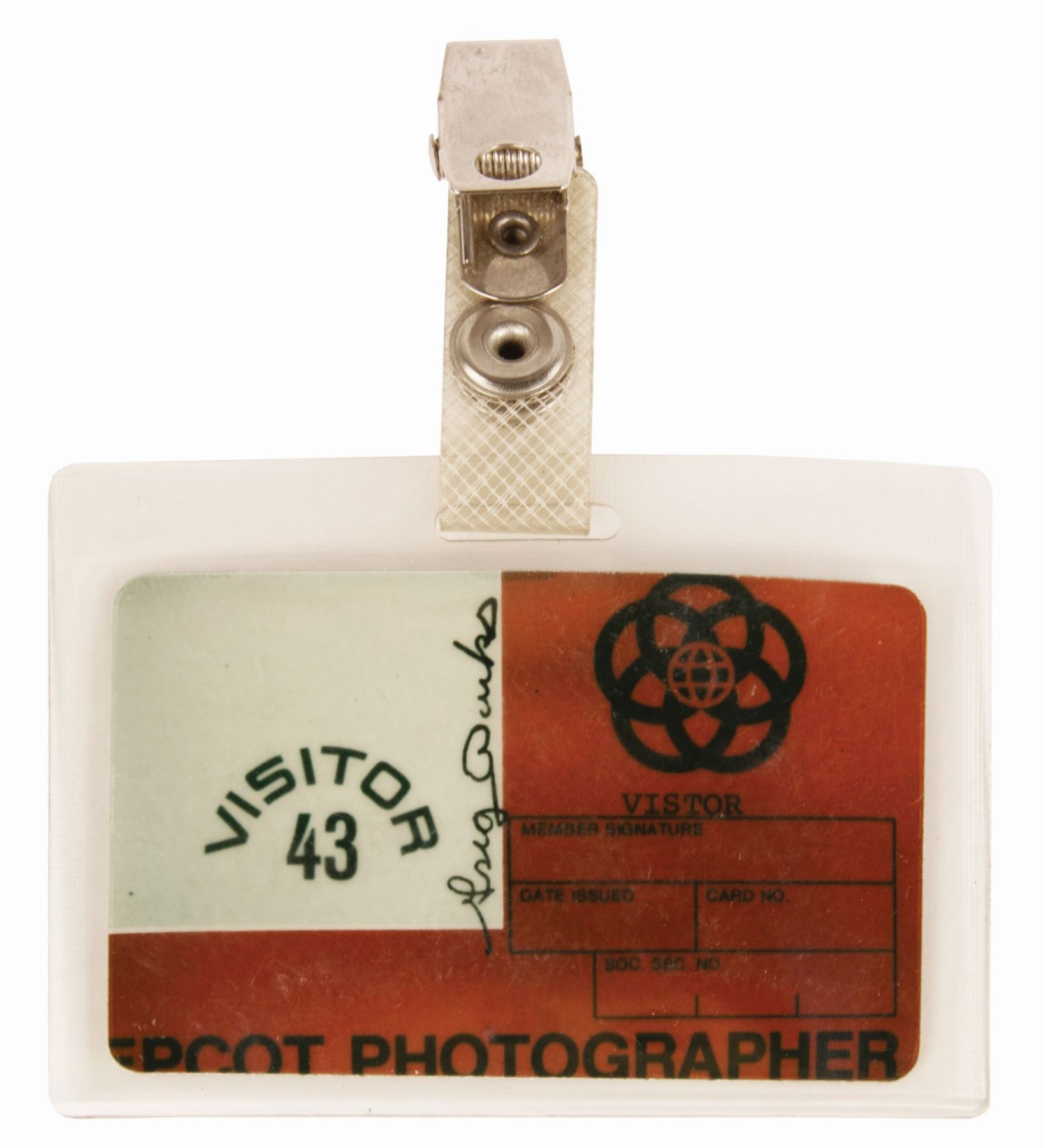 (Epcot, 1982) A very rare visitor badge worn by a photographer at Epcot Center prior to its opening. Numbered for "Visitor 43," this badge has the printed signature of its original user and measures 2.25"x3.25", not including the clip. The condition is good with some surface wear from use.