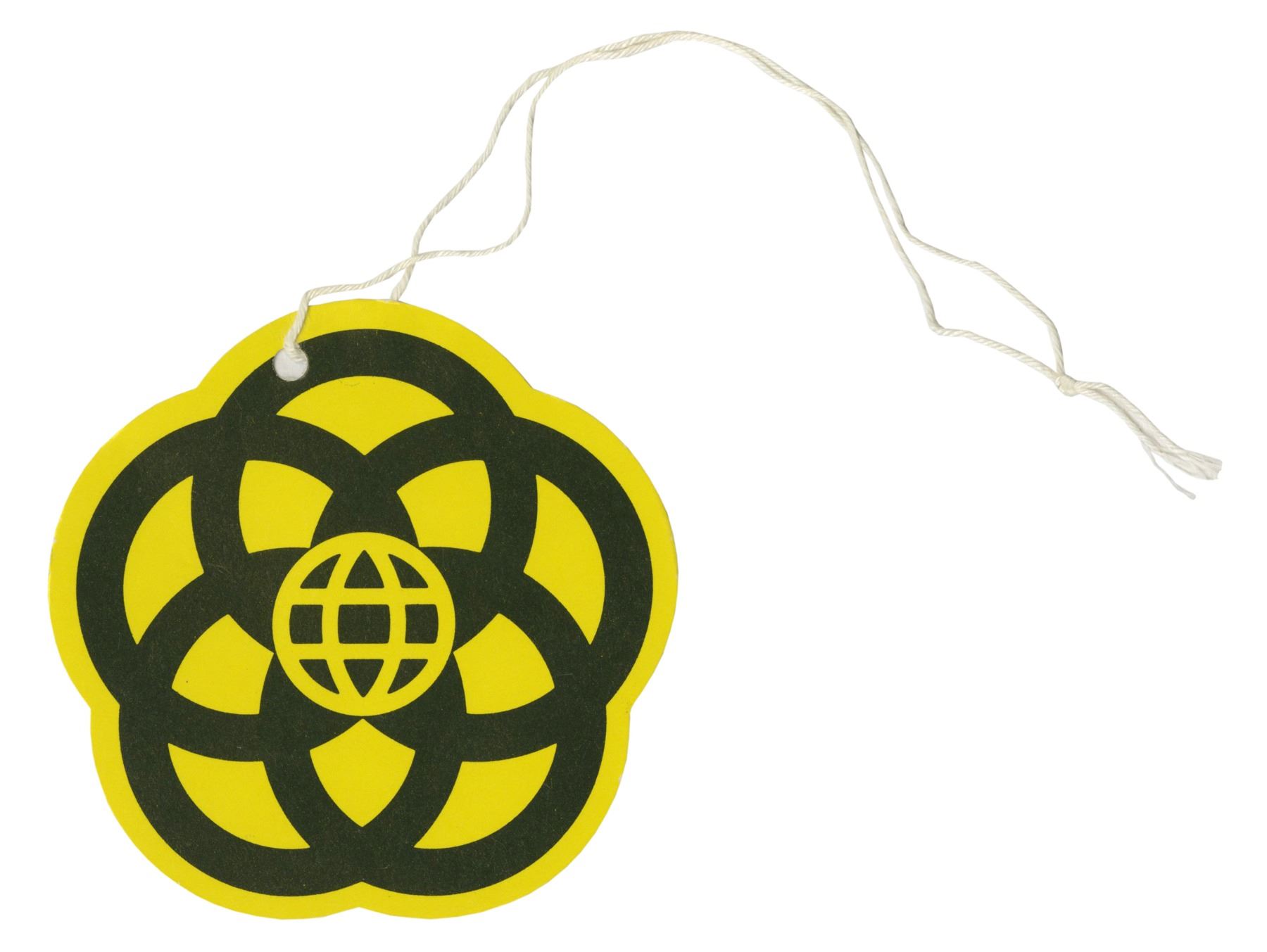 (Epcot, 1982) A very rare paper badge worn by guests visiting Epcot before the official opening. The die-cut yellow badge features Epcot's logo on both sides and has a thin string attached to the top. Measuring 3.25" in diameter, the badge is in very fine condition.