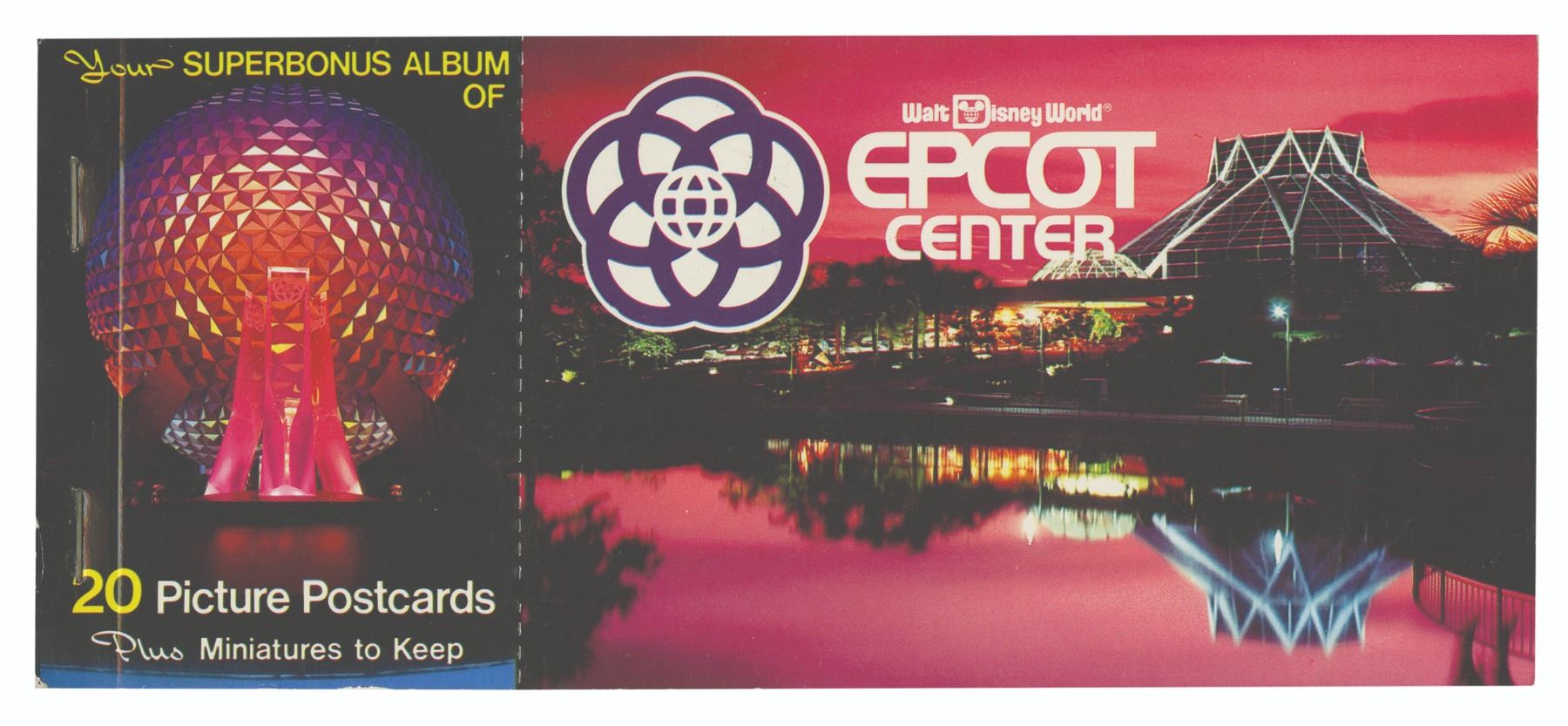 (Epcot, 1982) A booklet of (20) unused picture postcards of Epcot Center. The booklet contains vibrant color photos of the countries from World Showcase, the Friendship II boat, Future World, Spaceship Earth, and more. The booklet also includes miniature versions of each postcard. Measuring 3.5"x8", the booklet is in very good condition with minor wear.