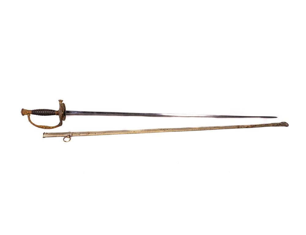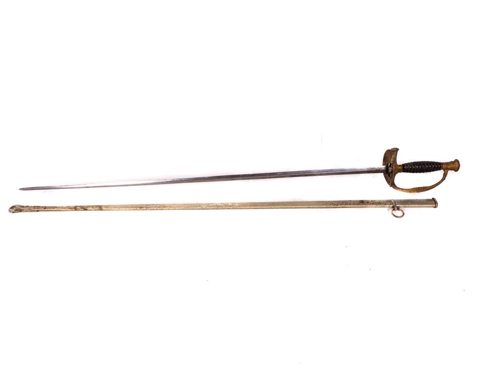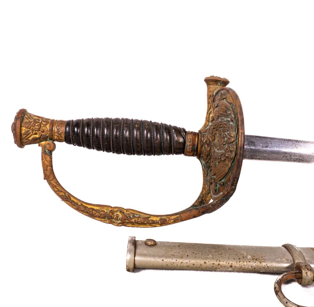3e REpublique Française, marquEe au ricasso. Garde en laiton articulEe sur un côtE et ornEe d'Etendards croisEs. Garde en D dEcorEe de motifs floraux, poignEe en bois gainEe de fil de fer, fourreau en acier inclus.