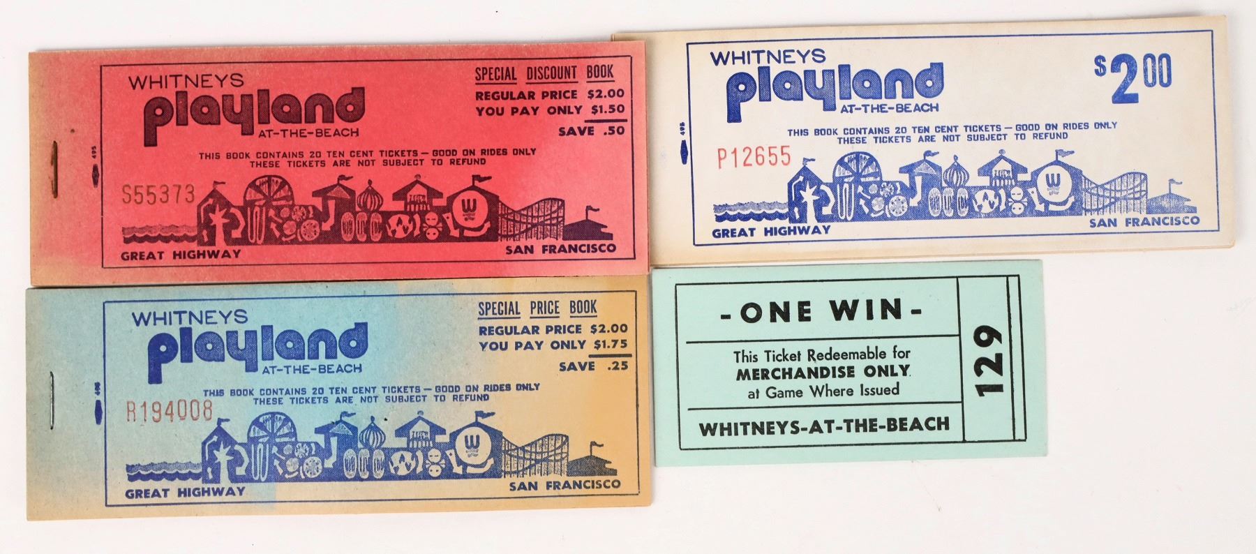 Lot of ticket books and separate ride tickets for Whitneys-At-The-Beach Playland, Great Highway/ San Francisco. The ride tix are interestingly named, "Mad Mine, Octopus, Limbo," etc. (3) Ticket coupon books plus more, please review.
