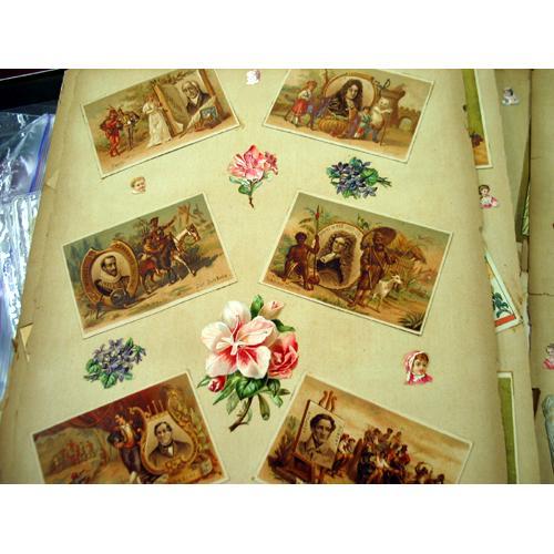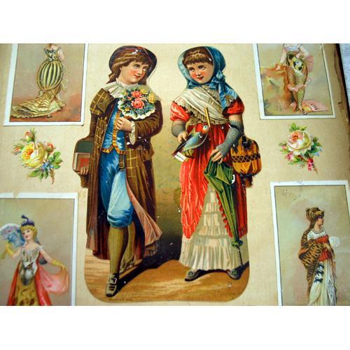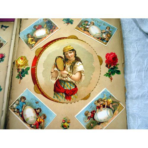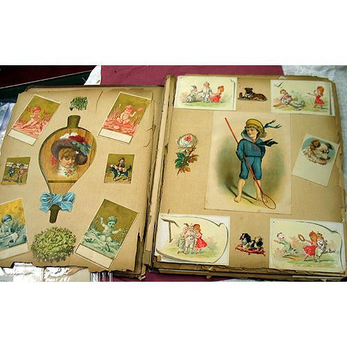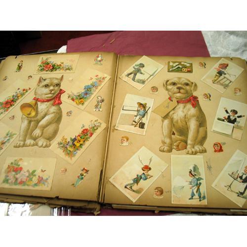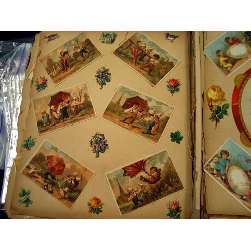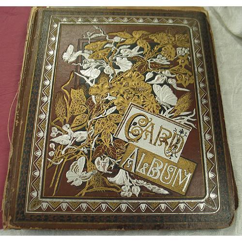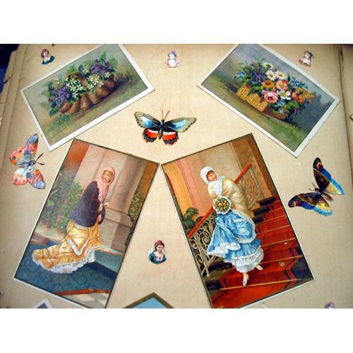 Embossed and painted card album filled with Victorian calling card die cuts, postcards and other pieces of ephemera - see images. Book is falling apart and the pages are tattered. The pieces are glued to the pages, still a very nice collection. As is