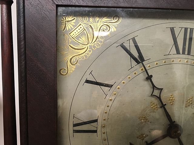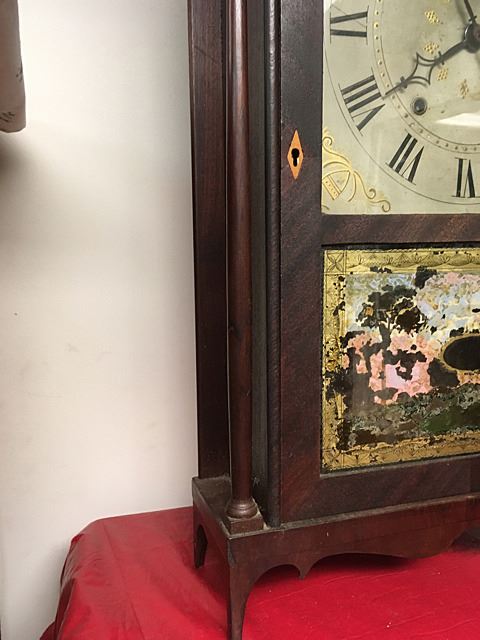 Ephraim Downes for George Mitchell, Bristol, CT Pillar and Scroll Clock with 3 urn finials, gold gilt painted clock face with shields in corners and center design, open diamond hands, reverse painted lower tablet, weight driven, wooden works, nice label "Improved Clocks, Manufactured by Ephraim Downes for George Mitchell, Bristol, Con.", key and pendulum. Has crack on upper left corner of upper glass.