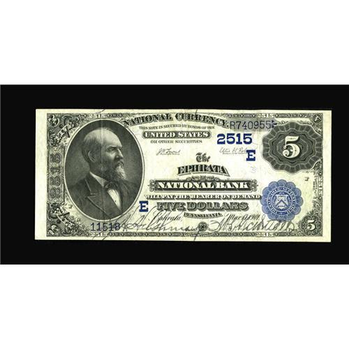 <B>Ephrata, PA</B></I> - $5 1882 Value Back Fr. 574 <B>The Ephrata NB</B></I> Ch. # (E)2515<BR>A handsome Lancaster County Value Back with unusually broad margins for this normally poorly margined issue. Bright <B>Very Fine,</B></I> a premium example.<BR><BR><b>Shipping:</b> Coins & Currency (<a target="_blank" href="http://www.heritageauctions.com/common/shipping.php">view shipping information</a>)