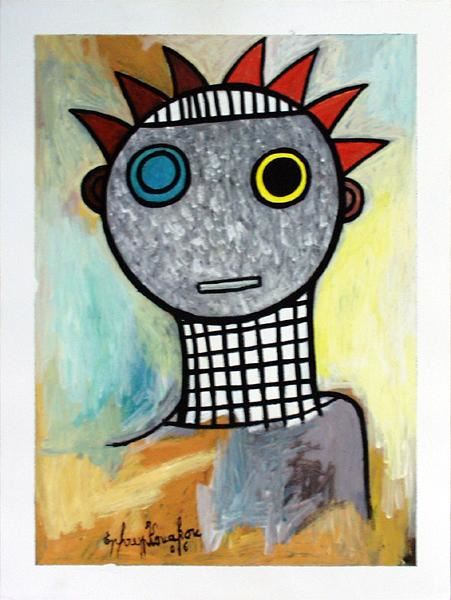 Artist: Ephrem Kouakou Title:Untitled XLI (Colorful Bust)Medium: acrylic & pigment on paper Date: 2006Full size: 24 x 18 inchesImage size: 21 1/8 x 15 1/8 inchesBiographyEphrem Kouakou an Ivory Coast native, has exhibited his work in the United States, Switzerland, Belgium, and France. His paintings are a blend of African and Western imagery in a rapturous dance of color and line that have as much to do with music as they do plastic arts. His bold folk art, inspired by his native culture, includes themes of fertility, brotherhood, the strength and the power of women, passion for life, and the understanding of sacrifice, reflection, and the inward journeys.His work transcends tradition and speaks of universal ideals, blending proud ancestry with modern culture. His canvases borrow from familiar archetypal images but the artist twists them into something contemporary and spiritual and very much his own iconography.Received from: http://www.artrev.com/art/artists/biography.asp?aid=919&artist=Ephrem%20Kouakou