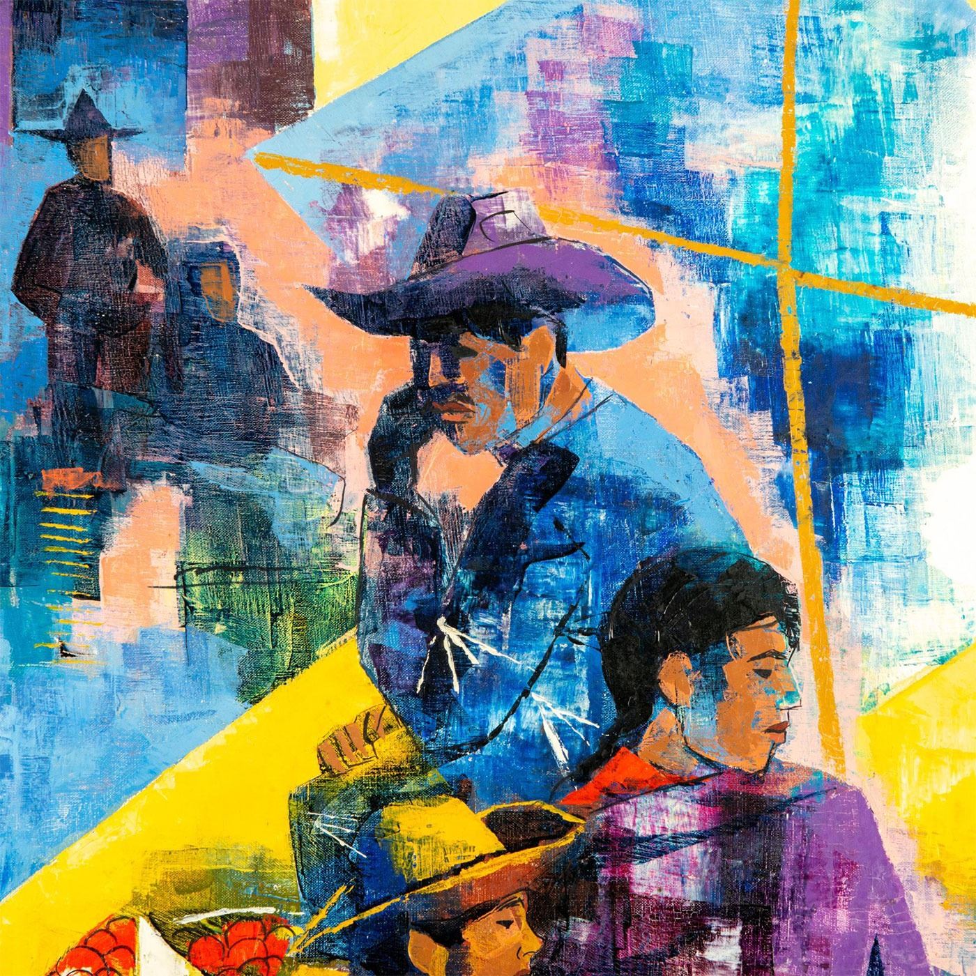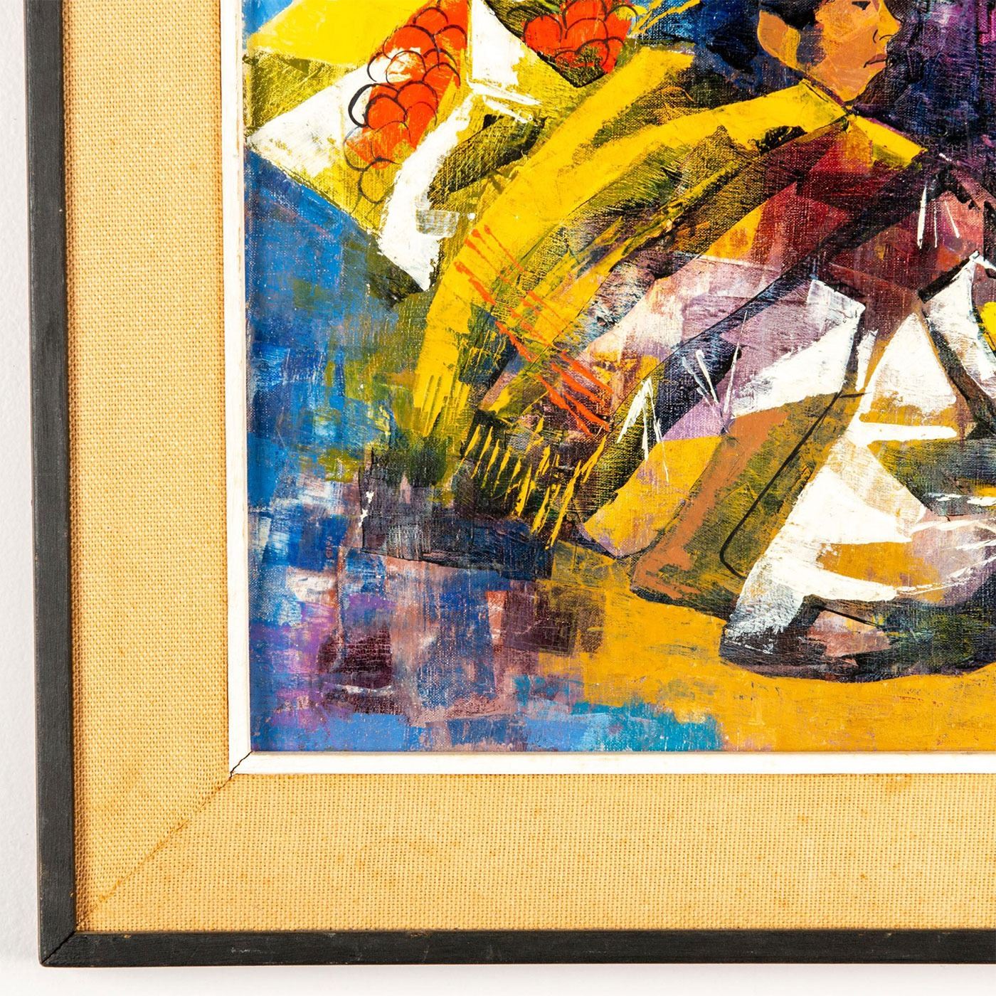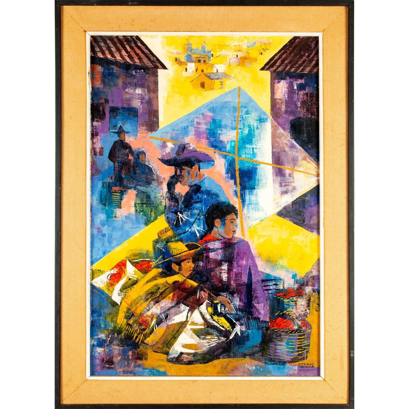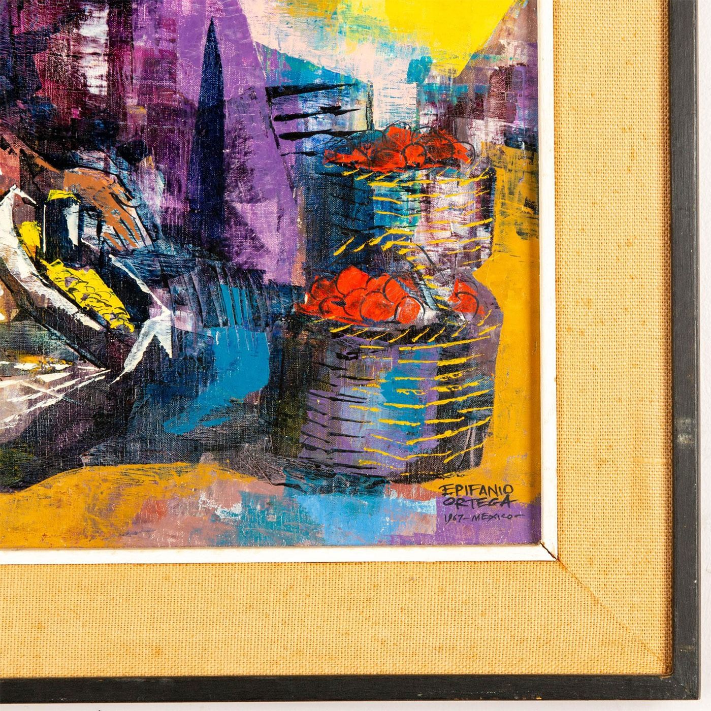 Stunning composition that depicts Mexican village scene of street vendors. Exquisitely colored in purples, blues and yellows. Signed by artist and dated 1967 lower right. Ortega is a Mexican artist best known for his brilliantly colored cubist style piece based on bull fights and market life. Wear to frame. Sight size: 29"H x 19"W. Frame: 35"H x 25"W. #art #Mexicanart