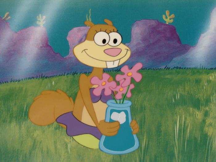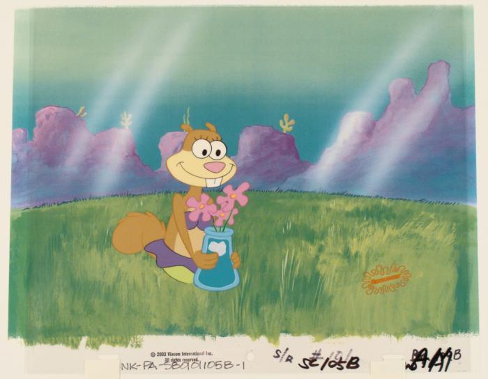 To create production cels, the original animator's drawing is transferred onto an acetate cel (by hand-inking and/or photo copying). The cel is then hand-painted on the reverse side. The background accompanying this set-up is a hand-painted original production background. The printed background is ready to be matted and framed. It is a colored background with a cel and has the animator's notations at the bottom of the background and the cel. The background is a printed reproduction background. This art peice comes with a Certificate of Authenticity. There is a Nickelodeon logo on the bottom right of the cel. The cel has multiple layers; first is the jug with flowers in it and the second cel is Sandy Cheeks.