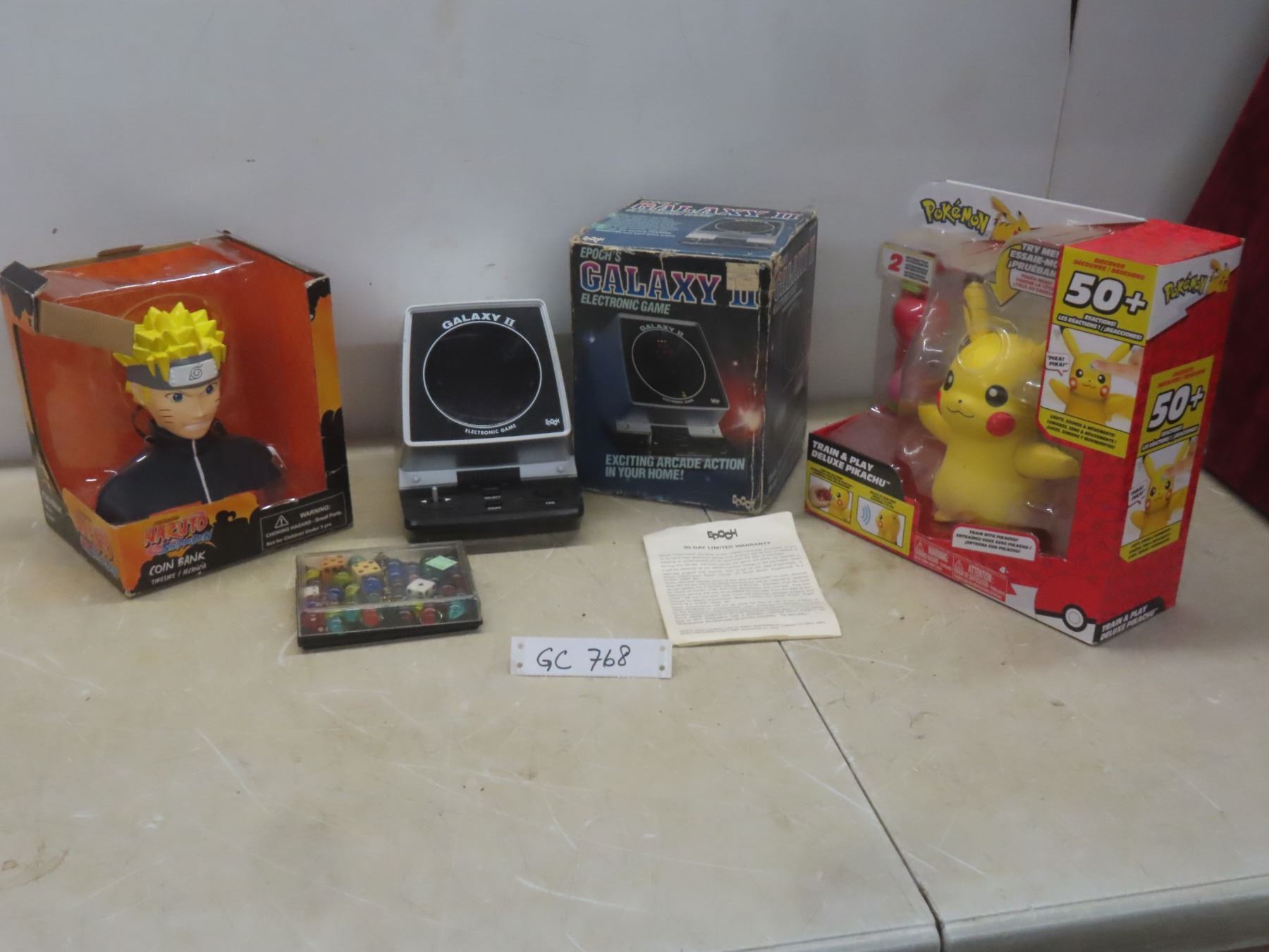 Epochs Galaxy II Electronic Game; Pokémon and Naruto Coin Bank; Dice and Marbles