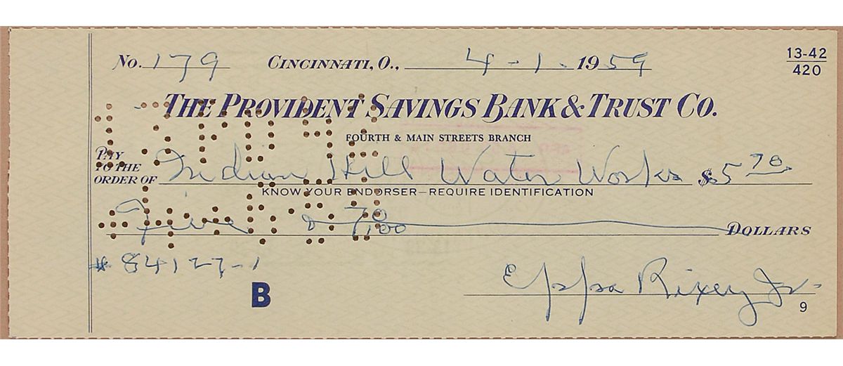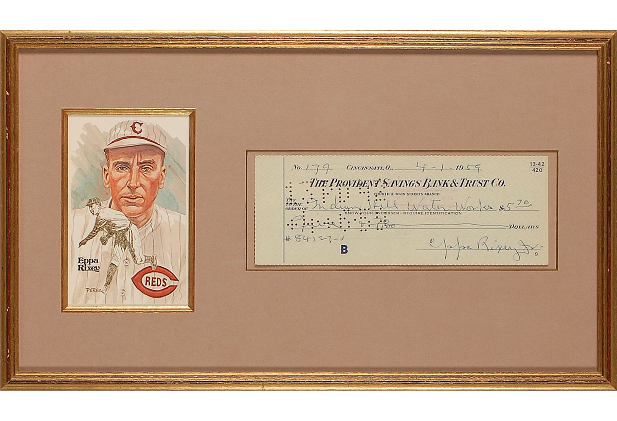Baseball Hall of Famer (1891-1963). Bank check, 8.25 x 3, filled out and signed by Rixey, “Eppa Rixey, Jr.,” payable to Indian Hill Water Works for $5.70, April 1, 1959. Matted and framed with a Perez-Steele card to an overall size of 17.25 x 10.25. In fine condition, with a couple light vertical folds, and expected stamps and holes, none affecting the signature.