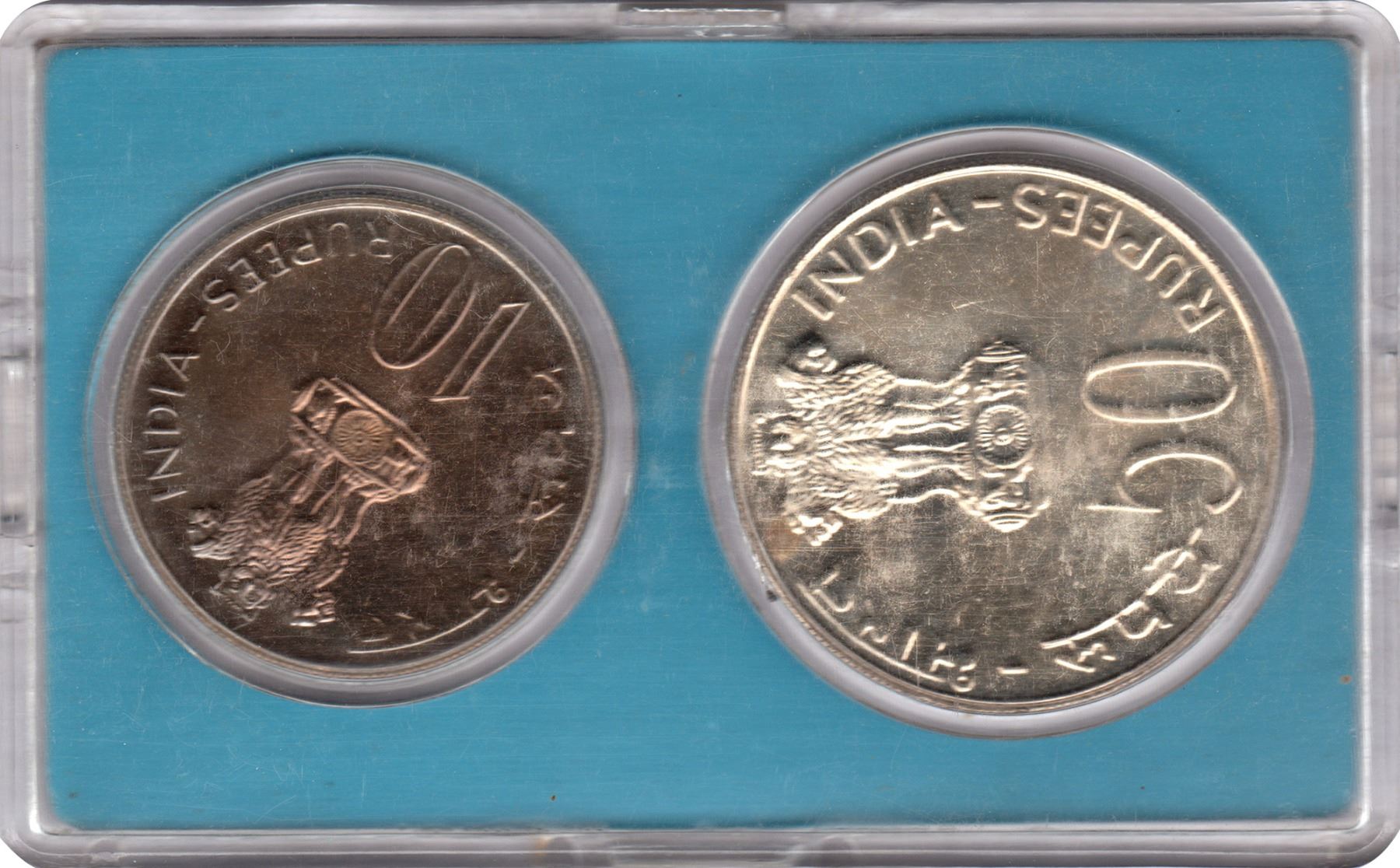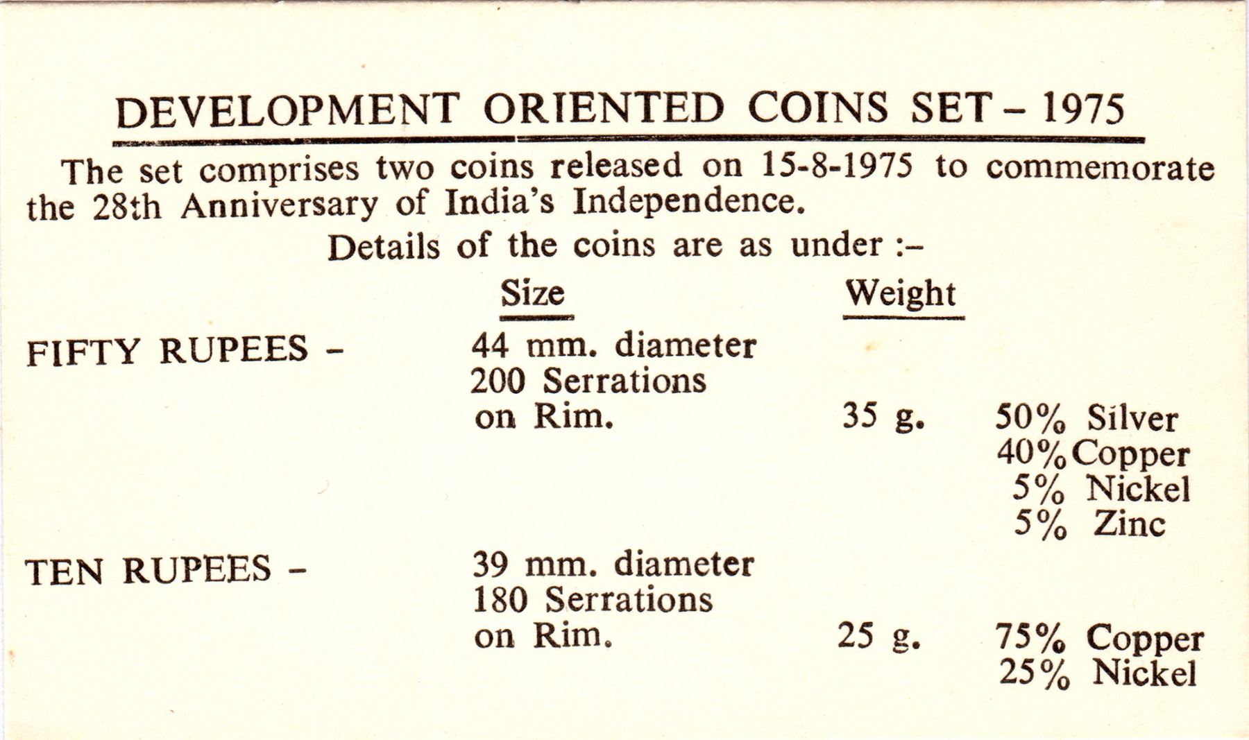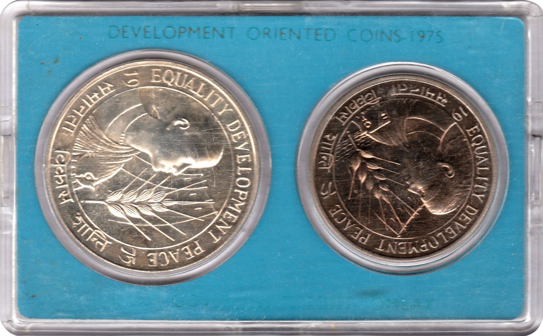 Republic India, 1975, UNC Set, Equality, Development, Peace, Set of 2 Coins, Silver 50 Rupees & Copper-Nickel 10 Rupees, Bombay Mint, (KM # MS 18/RB # 52), intact in an acrylic case with outer cover and certificate, UNC.