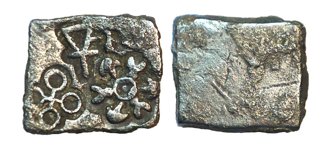 Eran region, Pre Satavahana, (2nd Century BC), Copper Unit, 1.37 gms, Obv. Punches of Triangle standard, six armed symbol, Ujjain symbol, Pieper #892, very fine, very scarce.