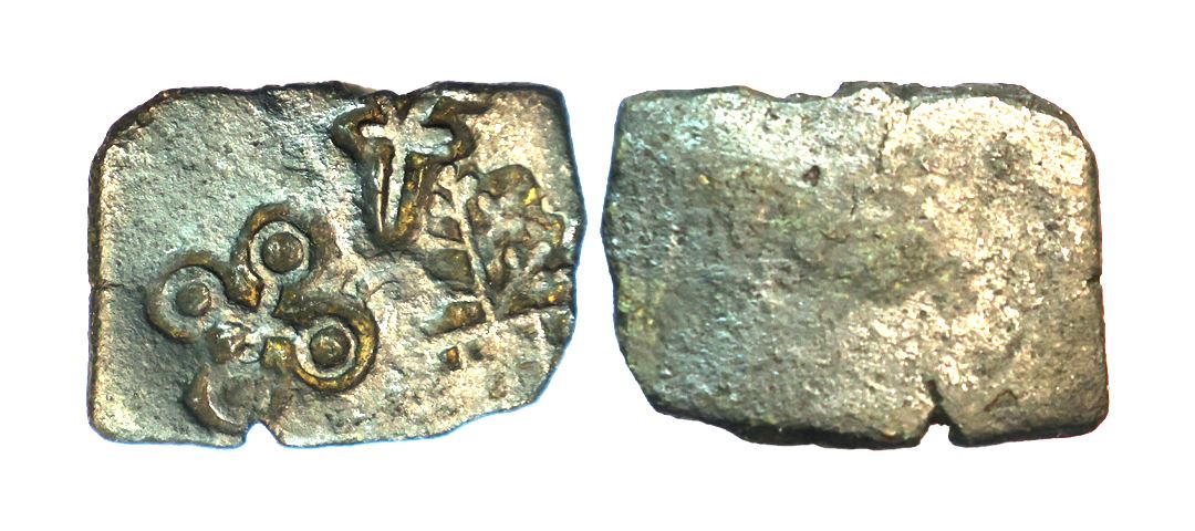 Eran region, Pre Satavahana, (2nd Century BC), Copper Unit, 4.63 gms, Obv. Punches of Triangle standard, tree in railing, Ujjain symbol, similar to Pieper #895, very fine, very scarce.