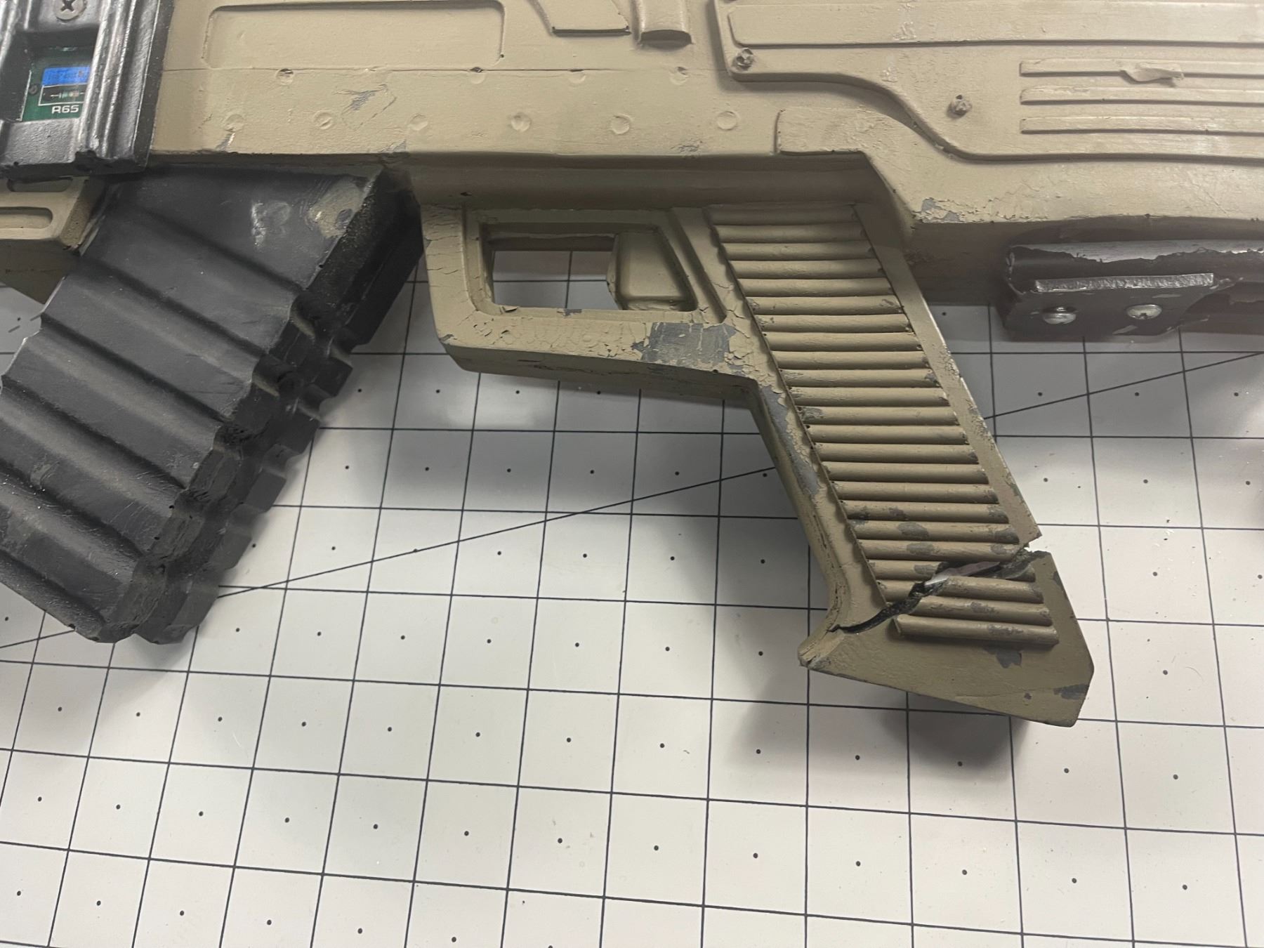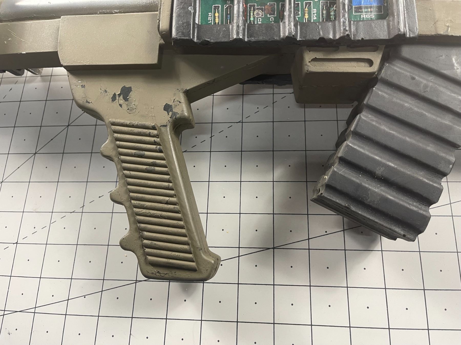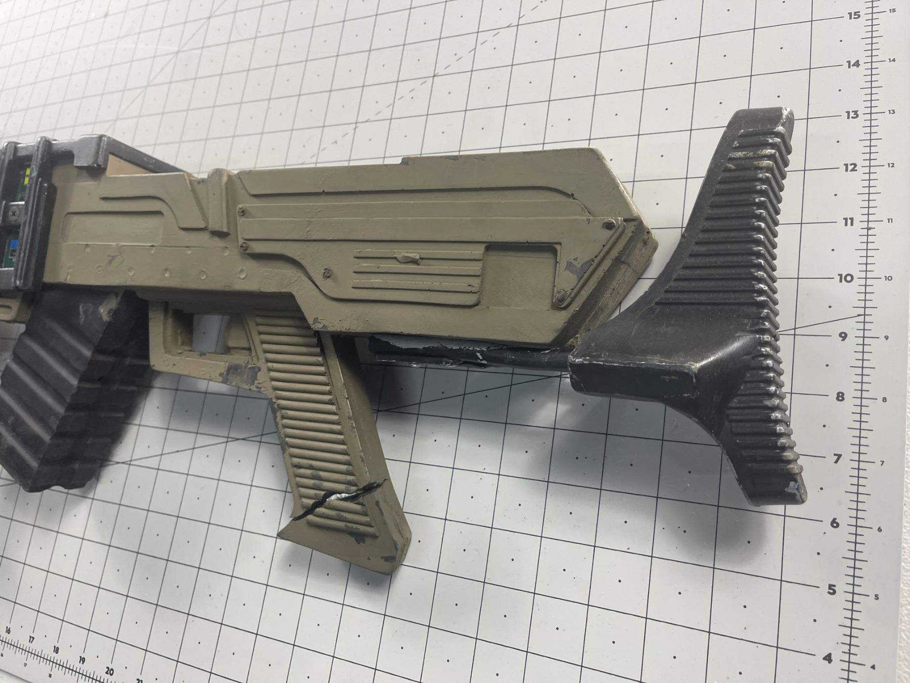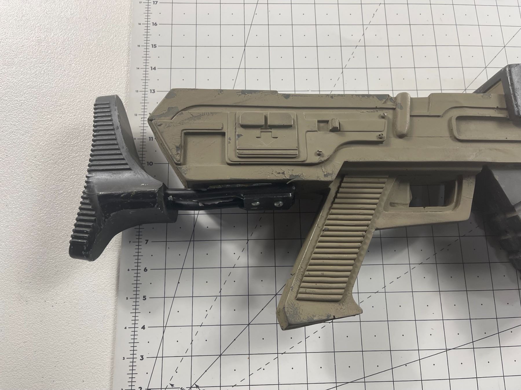 This piece is made from a variety of materials. The body is made from urethane, the barrel is made from metal, and pieces of resin trim is present. This gun shows some wear from use and storage, but the rifle remains in overall good condition. - Materials: Rubber, plastic, metal, foam
