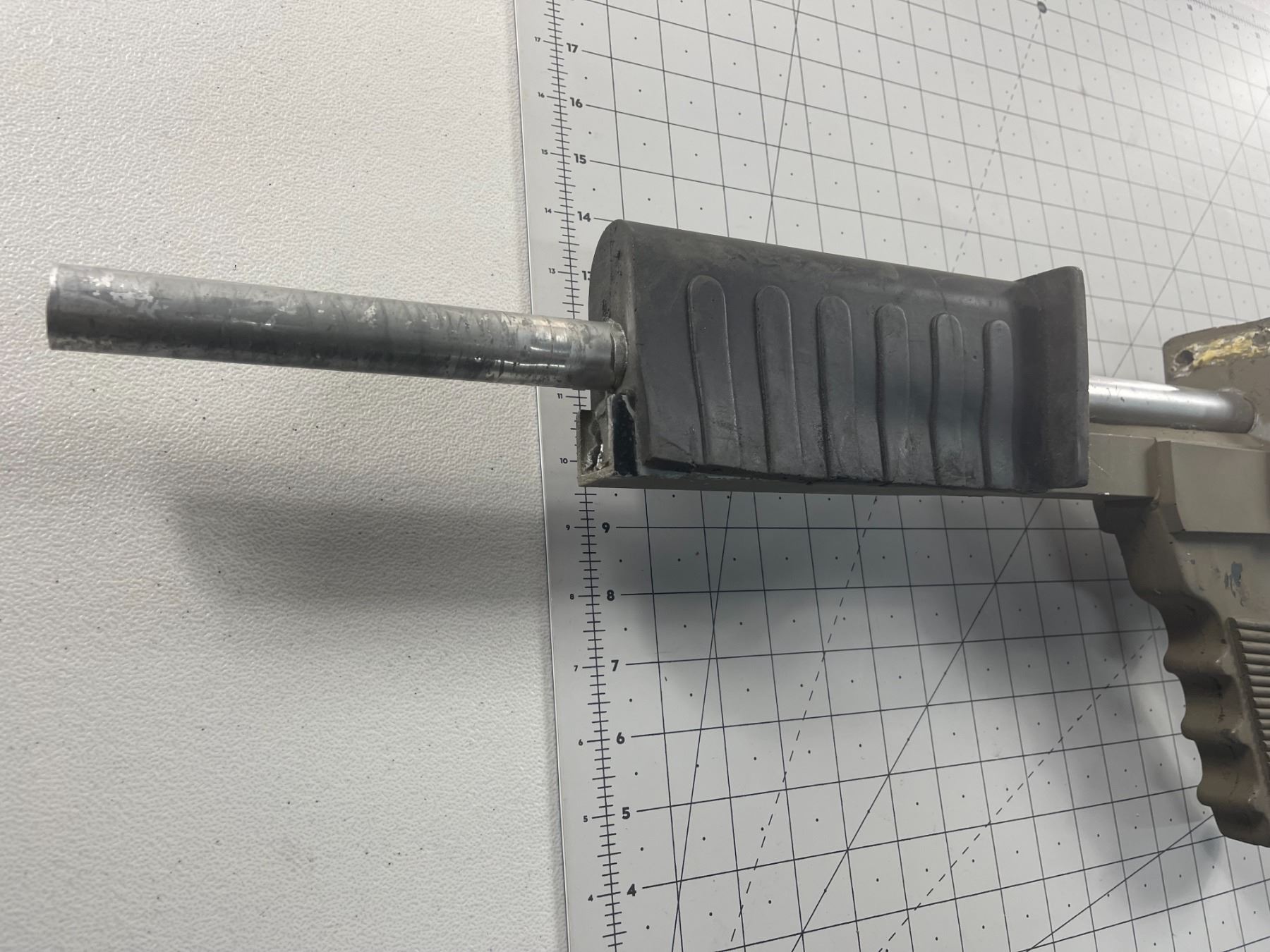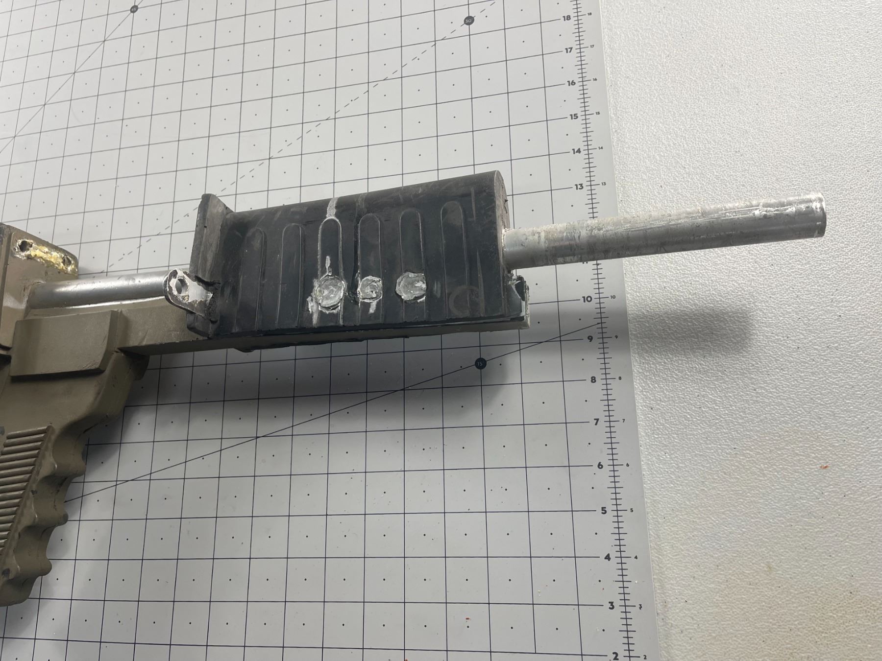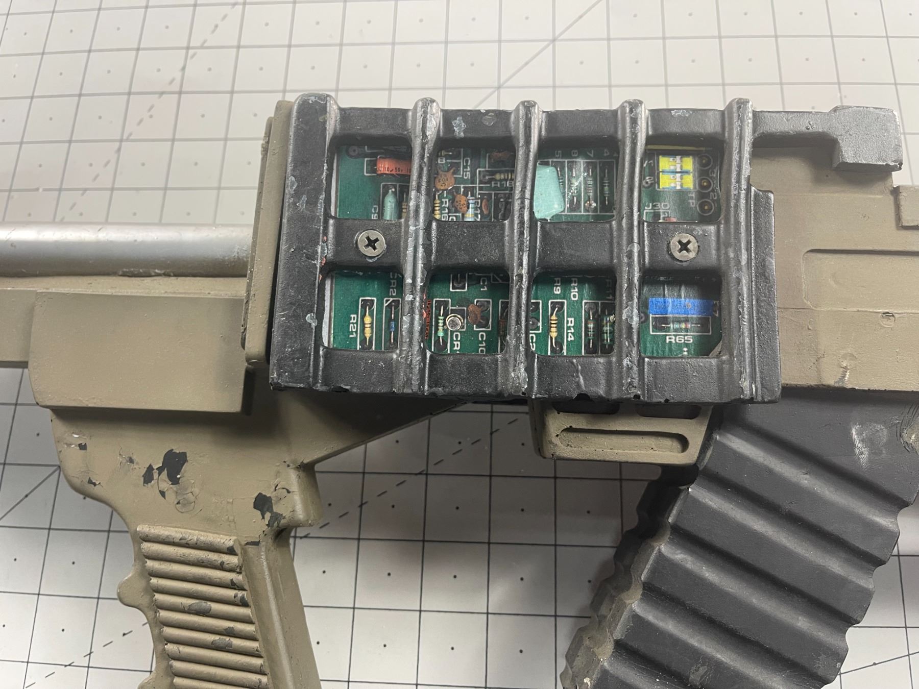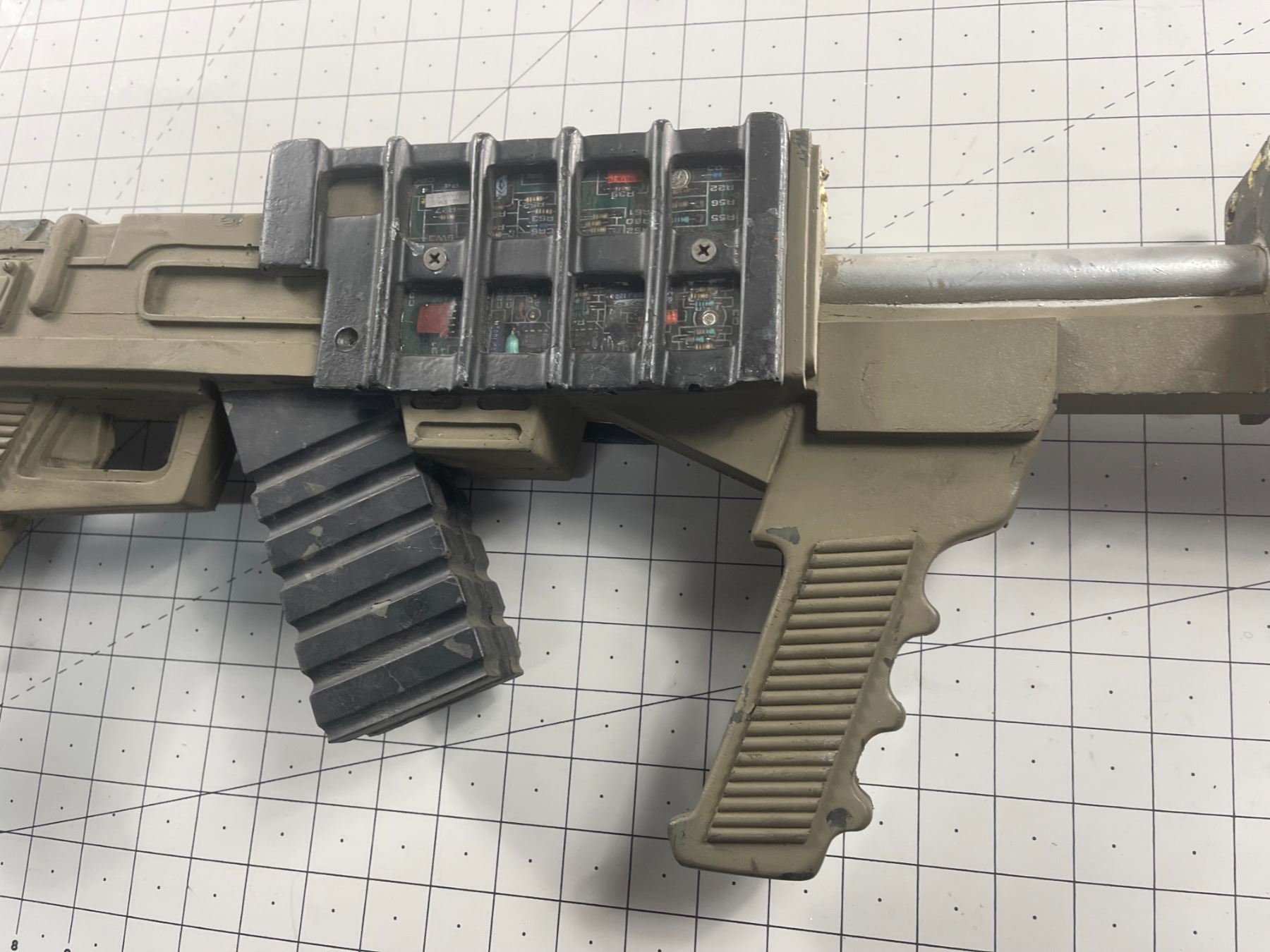 This piece is made from a variety of materials. The body is made from urethane, the barrel is made from metal, and pieces of resin trim is present. This gun shows some wear from use and storage, but the rifle remains in overall good condition. - Materials: Rubber, plastic, metal, foam