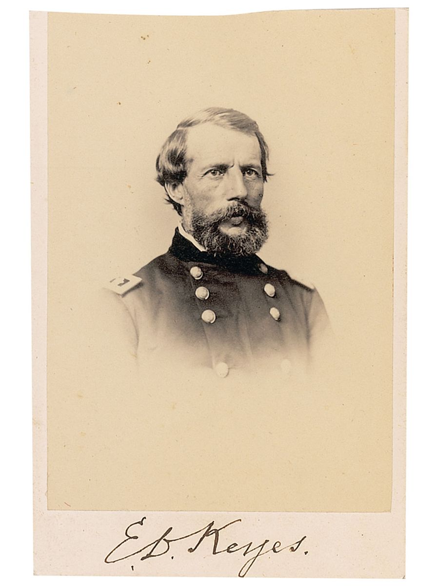 Union general (1810–1895) who commanded a brigade at the First Battle of Bull Run, saw action at Seven Pines, Savage’s Station, and Harrison’s Landing. He was removed from command by General John Dix after his retreat at Gettysburg. Original 2.25 x 3.5 carte-de-visite photo by J. E. McClees of Philadelphia, signed in the lower border in black ink, “E. D. Keyes.” A trimmed top edge, otherwise fine condition.
