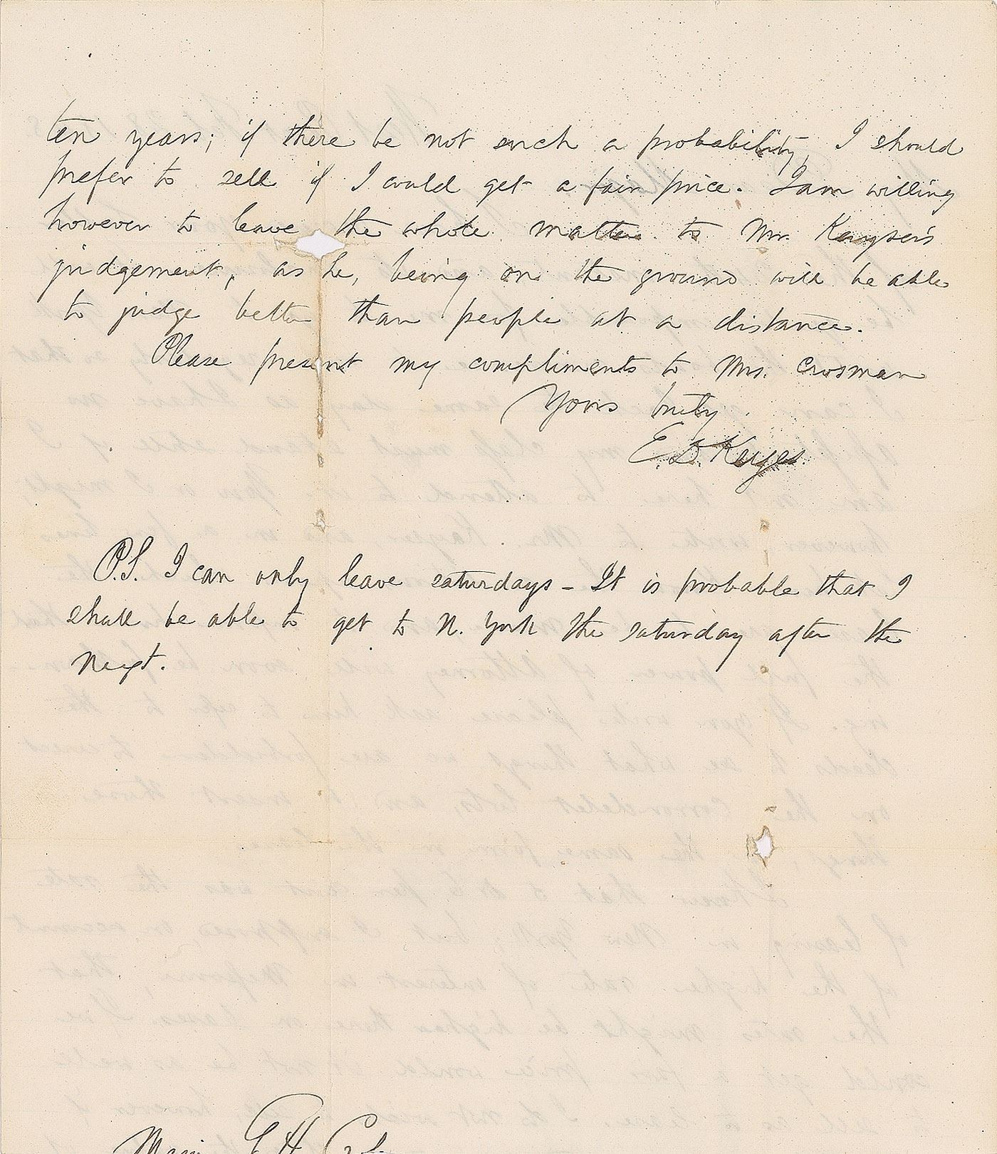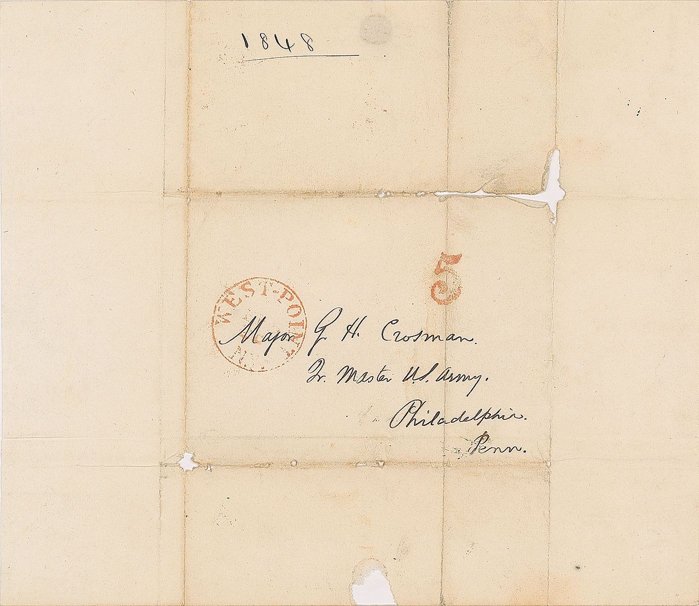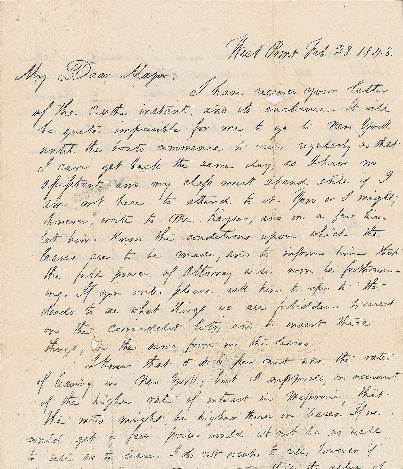 Union general (1810–1895) who commanded a brigade at the First Battle of Bull Run, saw action at Seven Pines, Savage's Station, and Harrison's Landing. He was removed from command by General John Dix after his retreat at Gettysburg. ALS signed “E. D. Keyes,” one page both sides, 7.75 x 9, February 28, 1848. Letter to Major G. H. Crosman, a quartermaster at Philadelphia, written from West Point. In part: "It will be quite impossible for me to go to New York until the boats commence to run regularly so that I can get back the same say; as I have no assistant and my class must stand still if I am not here to attend to it. You or I might, however, write to Mr. Kayser, and in a few lines let him know the conditions upon which the leases are to be made, and to inform him that the full power of attorney will soon be forthcoming. If you write please ask him to refer to the deeds to see that things we are forbidden to erect…I supposed, on account of the higher rate of interest in Missouri, that the notes might be higher there on leases. If we could get a fair price would it not be as well to sell as to lease…I am willing however to leave the whole matter to Mr. Kayser's judgement." Addressed on the reverse of the second integral sheet in Keyes's hand. In very good condition, with the bottom of the letter trimmed off, areas of paper loss along intersecting folds, and seal-related paper loss to the integral address leaf.