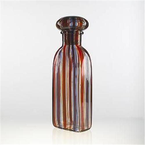 Ercole Barovier stoppered bottle Barovier & Toso Italy, c. 1960 polychrome glass bands 5 w x 2.5 d x 15 h inches Signed with applied manufacturer's paper label to side: [Barovier & Toso Murano 22875 Made in Italy].