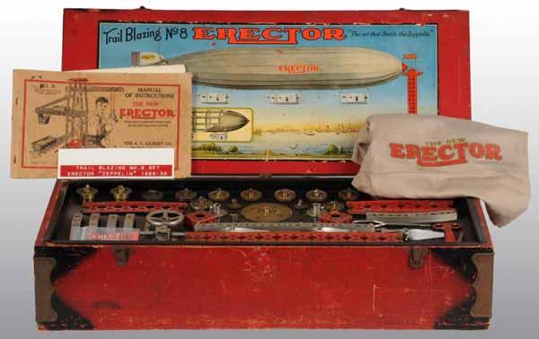 Description Made by A.C. Gilbert. Appears to be complete. Includes scarce, original canvas and instruction manual. Also includes original wooden box with beautiful decal of zeppelin under the top lid. Condition (Very Good - Excellent). Size Box: 11" x 26".