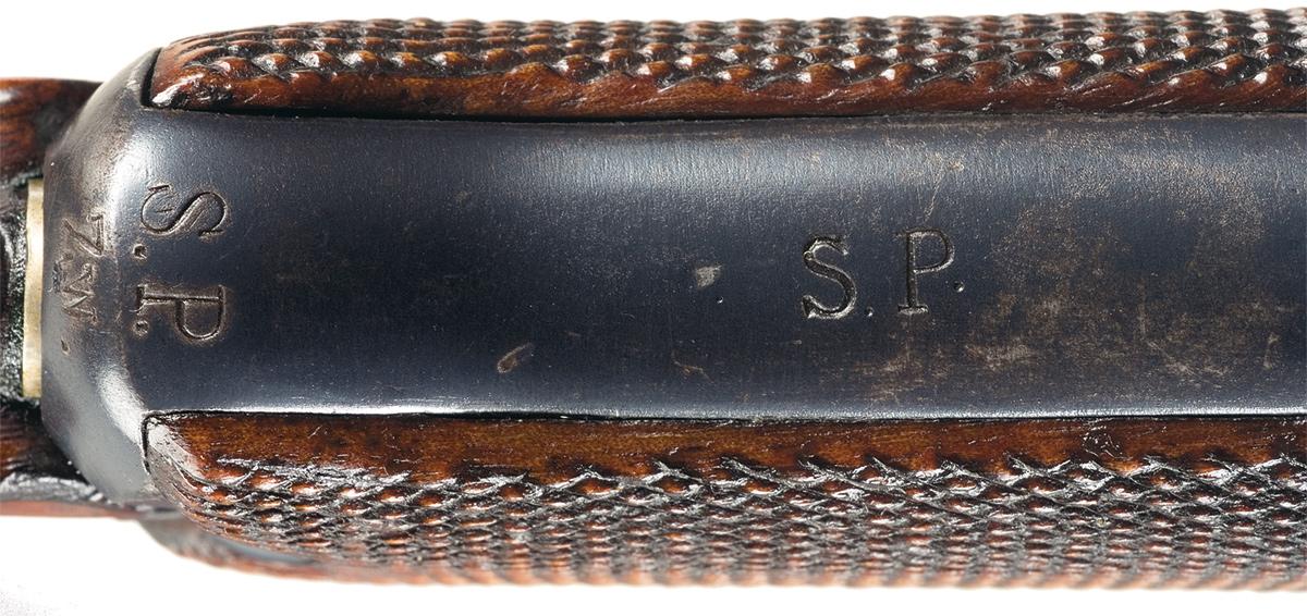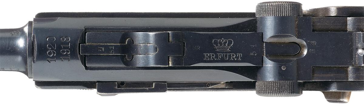 Produced in Prussia in 1918, and later reworked for used by the post-War Weimar Republic. Fixed sights, with "1920/ 1918" stamped on the chamber and "crown/ ERFURT" on the toggle. Right side of the extension has the three "crown/ gothic letter" proofs next to the Imperial firing proof, which is repeated on the barrel and breechblock, the "crown/ RC" rework proof on the extension, barrel, trigger guard and rear toggle, and scattered letter proofs on many parts. Side plate cut to accommodate a sear safety, now absent. Some parts renumbered. Checkered hardwood grips and nickel magazine with wood base. Marked "S.P." and "S.P./ Zw.", suggesting Sicherheitspolizei (Security Police) issue.
