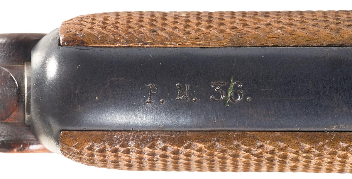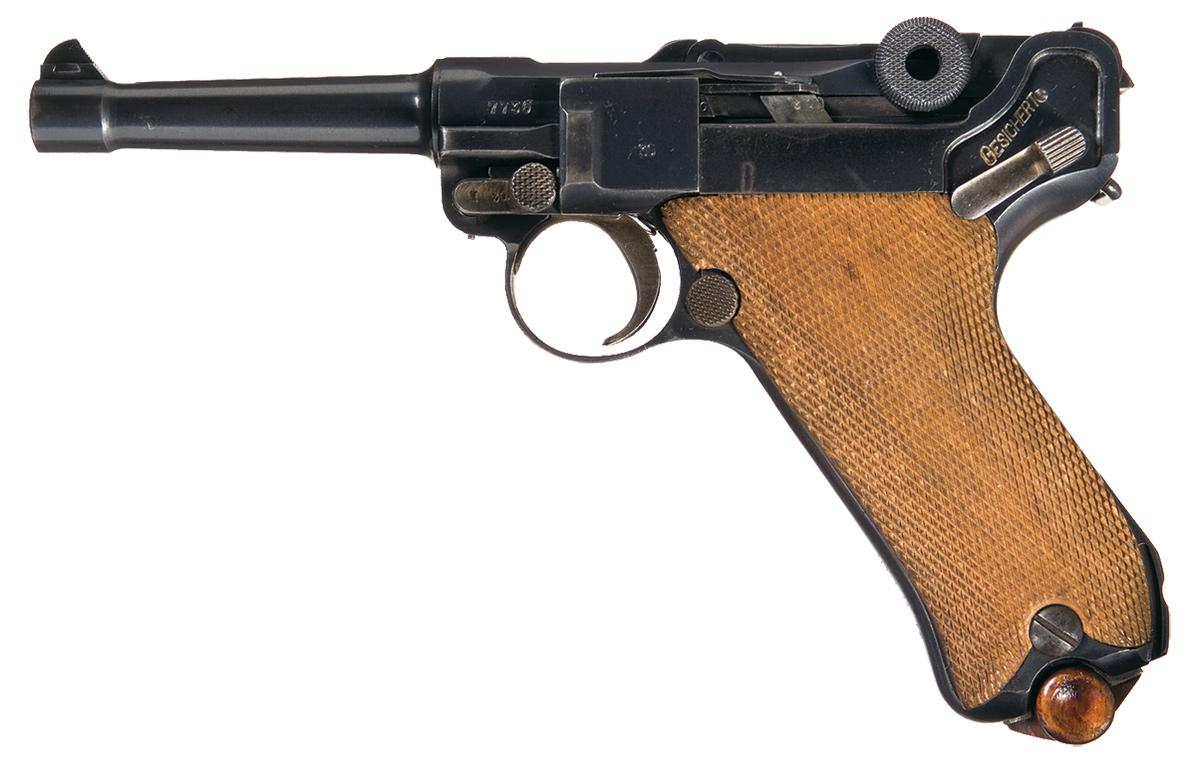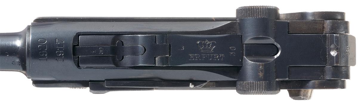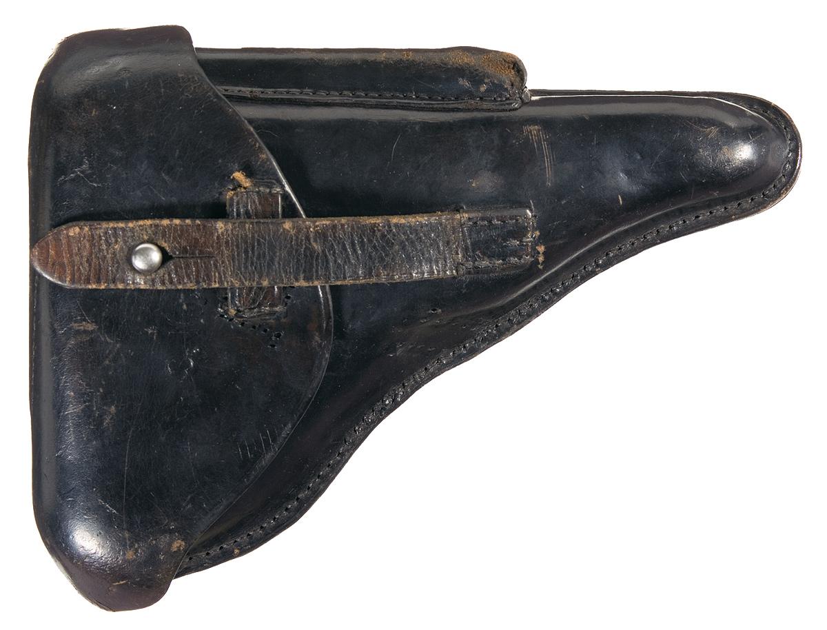 Produced in Prussia in 1917, and later reworked for used by the post-War Weimar Republic. Fixed sights, with "1920/ 1917" stamped on the chamber and "crown/ ERFURT" on the toggle. Right side of the extension has "G", the three "crown/ gothic letter" proofs and a "crown/ RC" rework proof next to the Imperial firing proof, which is repeated on the barrel and breechblock, with scattered letter proofs on many parts. Side plate cut down and fitted with a sear safety. Unnumbered barrel, with "eagle/ 33" (Simson, Thuringen) proof. Some parts renumbered. Front strap has been stamped "P.N.36.". Checkered hardwood grips and nickel magazine with wood base numbered to match the gun. With a black leather holster dated 1916, with "S.Mg.552/ 4045" struck out on the back and "S.Mg.I.R." on the flap.