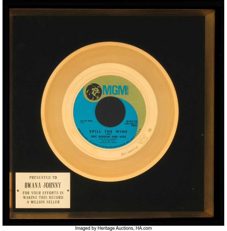 Eric Burdon and War "Spill the Wine" In-House Gold Sales Award. An appreciation/in-house award given in thanks for making "Spill the Wine" the hit it was. According to the plaque in the bottom left corner, "Presented To / Bwana Johnny / For Your Efforts In / Making This Record / A Million Seller." Measures 12" square. In Very Good condition with various chipping on the frame. COA from Heritage Auctions.