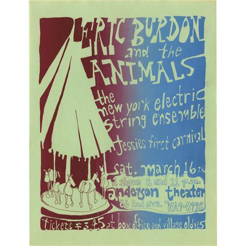 <B>Eric Burdon and the Animals Anderson Theater Concert Handbill (1969).</B></I> New York's Anderson Theater was a happening place in the late 1960s. In the days before Bill Graham opened the Fillmore East, the Anderson was <I>the</B></I> place to see a rock show in the Big Apple. They were known for their attractive handbills, many printed in a multi-color "split-fountain" technique. Here's a great example, promoting a March 16, 1969, show featuring Eric Burdon and the Animals. It's printed in maroon and blue, on light green bond, and is in NM condition. This would look great framed!<BR><BR><b>Shipping:</b> Flat Material, Small (<a target="_blank" href="http://www.heritageauctions.com/common/shipping.php">view shipping information</a>)