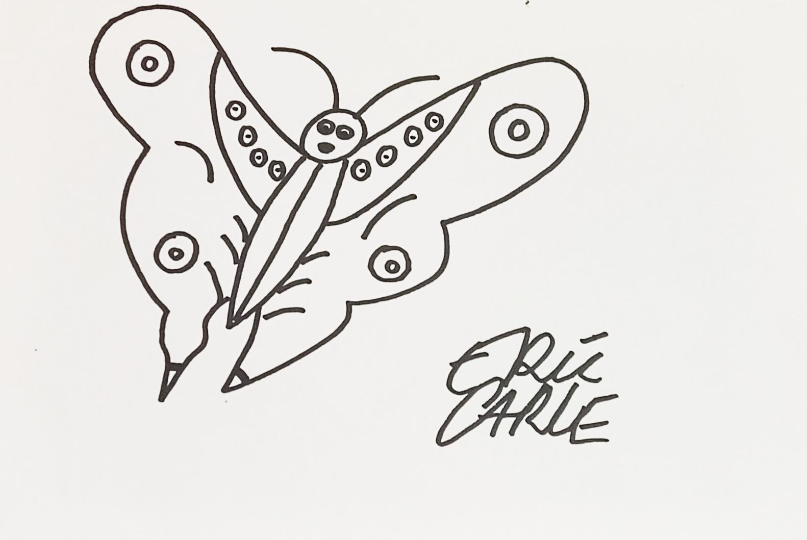 Eric Carle was one of the best known illustrators of our time. The creator of more than 70 picture books, he combined winsome stories and exuberant collages that appeal to young readers and adults alike. A drawing of the 'Butterfly' by Carle and signed on 12x8 inch paper. Supplied with coa.