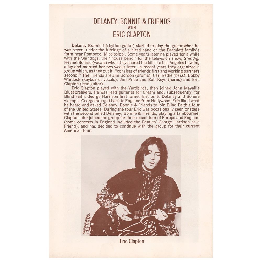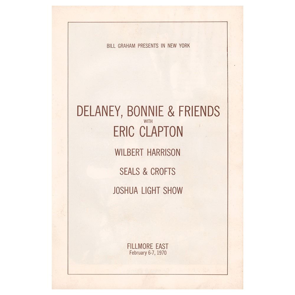 Concert program for Delaney and Bonnie & Friends with Eric Clapton at the Fillmore East in New York on February 6–7, 1970, 5.5 x 8.5, featuring biographies and images of the musicians inside, along with supporting acts Wilbert Harrison and Seals & Crofts. Delaney and Bonnie opened up for Blind Faith on their 1969 US tour. Clapton seeking to break away from stardom, started gigging with them while they were on the British tour in 1970. The album Delaney and Bonnie & Friends On Tour with Eric Clapton was released and a US tour was set up to promote the record, resulting in these concerts at the Fillmore East. Ironically, the band included Bobby Whitlock, Jim Gordon, and Carl Radle, who with Clapton would form Derek and the Dominos months later. In very good to fine condition, with some light staining to front cover and rippling to inner pages from onetime water exposure (it rained that evening).