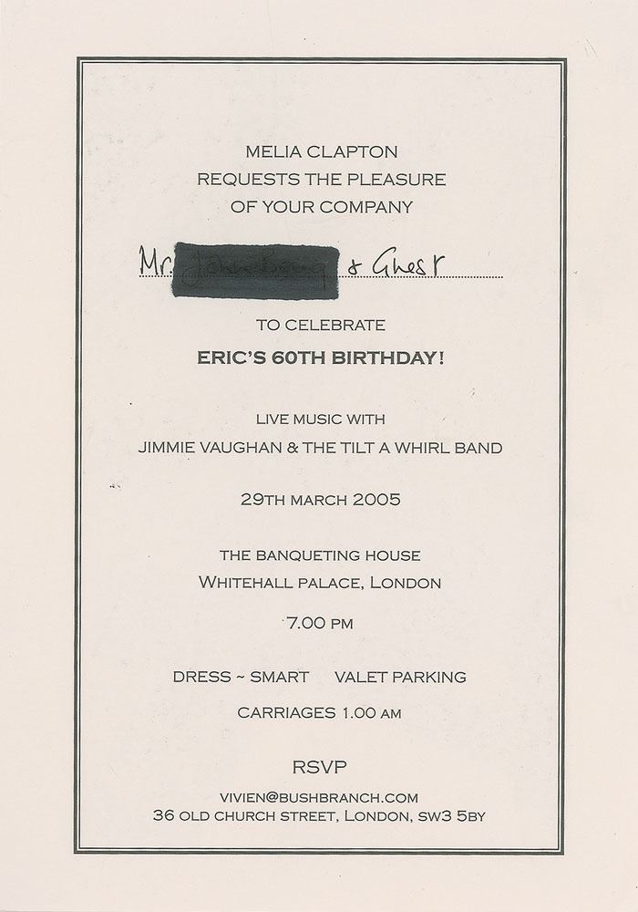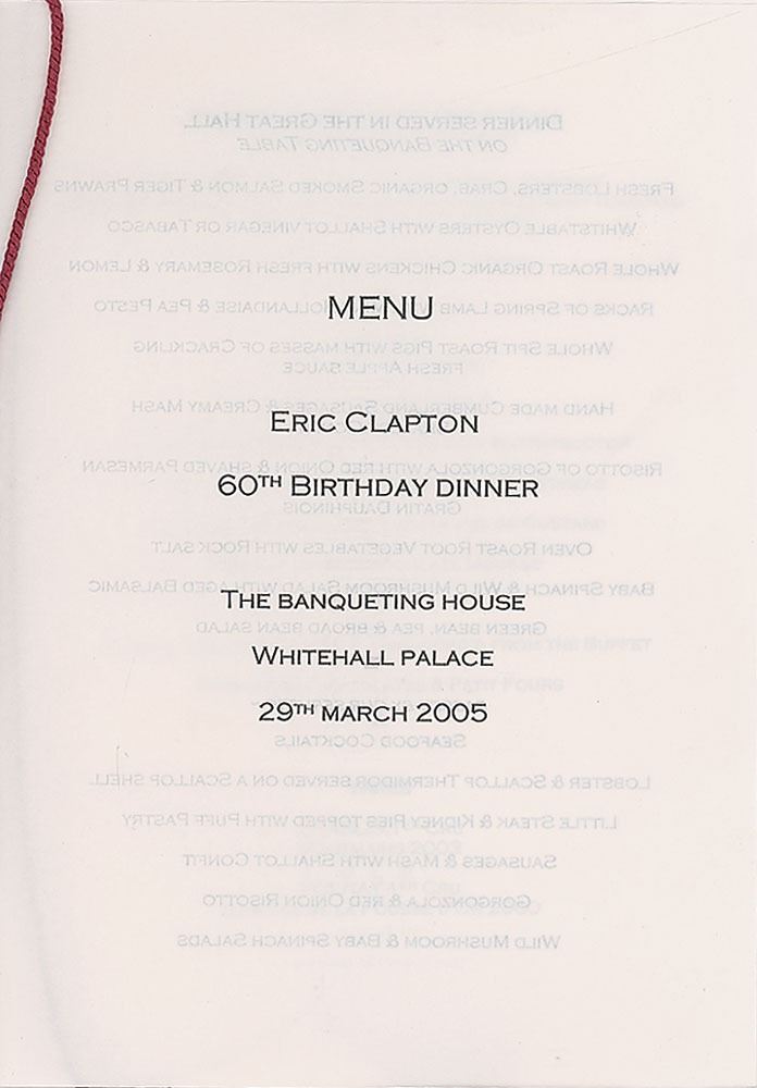 Official invitation program to Eric Clapton’s 60th birthday party, held at the Banqueting House at London’s Whitehall Palace on March 29, 2005, 6 x 8.25, unsigned, with front and back covers featuring images of Clapton as a young boy, and the inside containing the menu and invitation card, which lists Jimmie Vaughan and the Tilt-a-Whirl Band as the live musical act. In fine condition, with the recipient's name neatly blacked out.