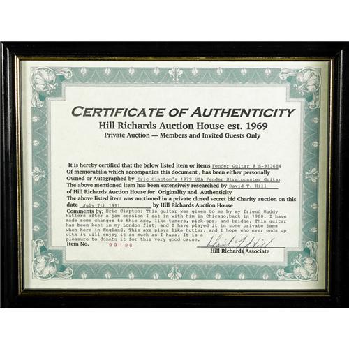 <B>Eric Clapton Guitar.</B></I> This one-of-a-kind 1979 Fender Stratocaster guitar, a spellbinder both in its look and its history, is a "twice-blessed" instrument with connections to two music legends. It originally belonged to Muddy Waters, whose famous 1958 tour inspired the Beatles, the Rolling Stones, Led Zeppelin, and Eric Clapton and his band Cream. Waters gave the guitar to Clapton after a Chicago jam session in 1980, the year before Waters passed away. Clapton cherished this wonderful gift, kept it in his London flat, played it only on special gigs and did a bit of customizing on the tuners, pick-up and bridge. In 1991, this ultra-rare gem was one of three guitars Clapton donated to an AIDS Charity Auction and it sold that July in the mid-five-figure range. The guitar, with its black body and black pick guard, comes in a display case along with a well-worn concert shoulder strap and pack, as well as a COA. In 2005, Eric Clapton's legendary guitar "Blackie" sold for $998,000. Due to the unique nature and history of this guitar, the consignor believes it to be "priceless," but has arranged with Heritage Galleries a low starting bid to make this rare and unique instrument an obtainable piece of music history. In Excellent condition.<BR><BR><b>Shipping:</b> Musical Instruments, Large (<a target="_blank" href="http://www.heritageauctions.com/common/shipping.php">view shipping information</a>)