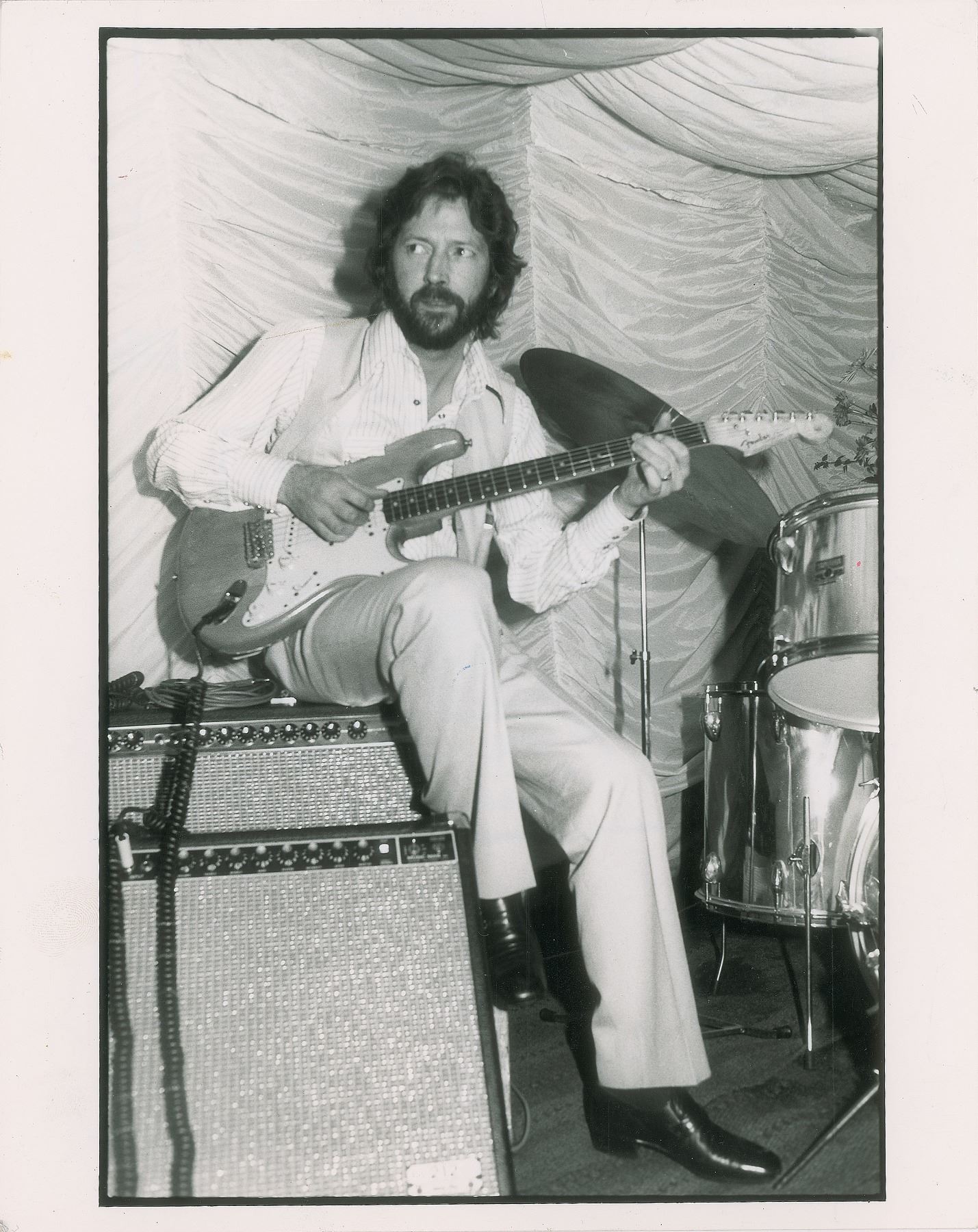 Original glossy 8 x 10 silver gelatin photo of Eric Clapton playing at the wedding of producer Glyn Johns in 1979, printed from the original negative circa 1970s-80s. Reverse bears a Paul Canty/LFI credit stamp. In fine condition. In very good to fine condition, with surface impressions from editorial notations on the back.
