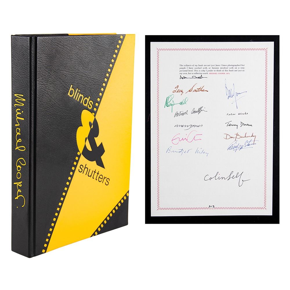 Signed book: Blinds & Shutters. Limited edition, numbered 213/5000. England: Genesis Publications, 1990. Hardcover with presentation box, 11 x 15.5, 368 pages. Signed on a special tipped in page in various inks by Eric Clapton, Ringo Starr, Bill Wyman, Peter Blake, Neil Aspinall, Don Bachardy, Patrick Caulfield, Adam Cooper, Terry Doran, Allen Jones, Bridget Riley, Colin Self, and Terry Southern. In fine condition, with one bumped corner to the box. This remarkable book was created as a tribute to rock and roll photographer Michael Cooper—the photographer behind the famous Sgt. Pepper's album sleeve—and features over 600 of his images, many of which were previously unpublished. The books in the limited edition were signed by various groups of Cooper's friends, and this is a particularly desirable combination with Eric Clapton, Starr of the Beatles, Wyman of the Rolling Stones, Sgt. Pepper’s cover artist Blake, and other musical notables—a truly magnificent work.