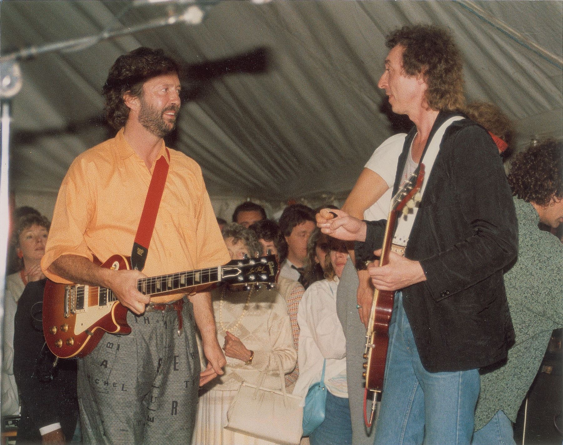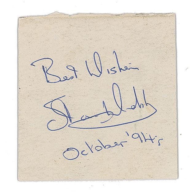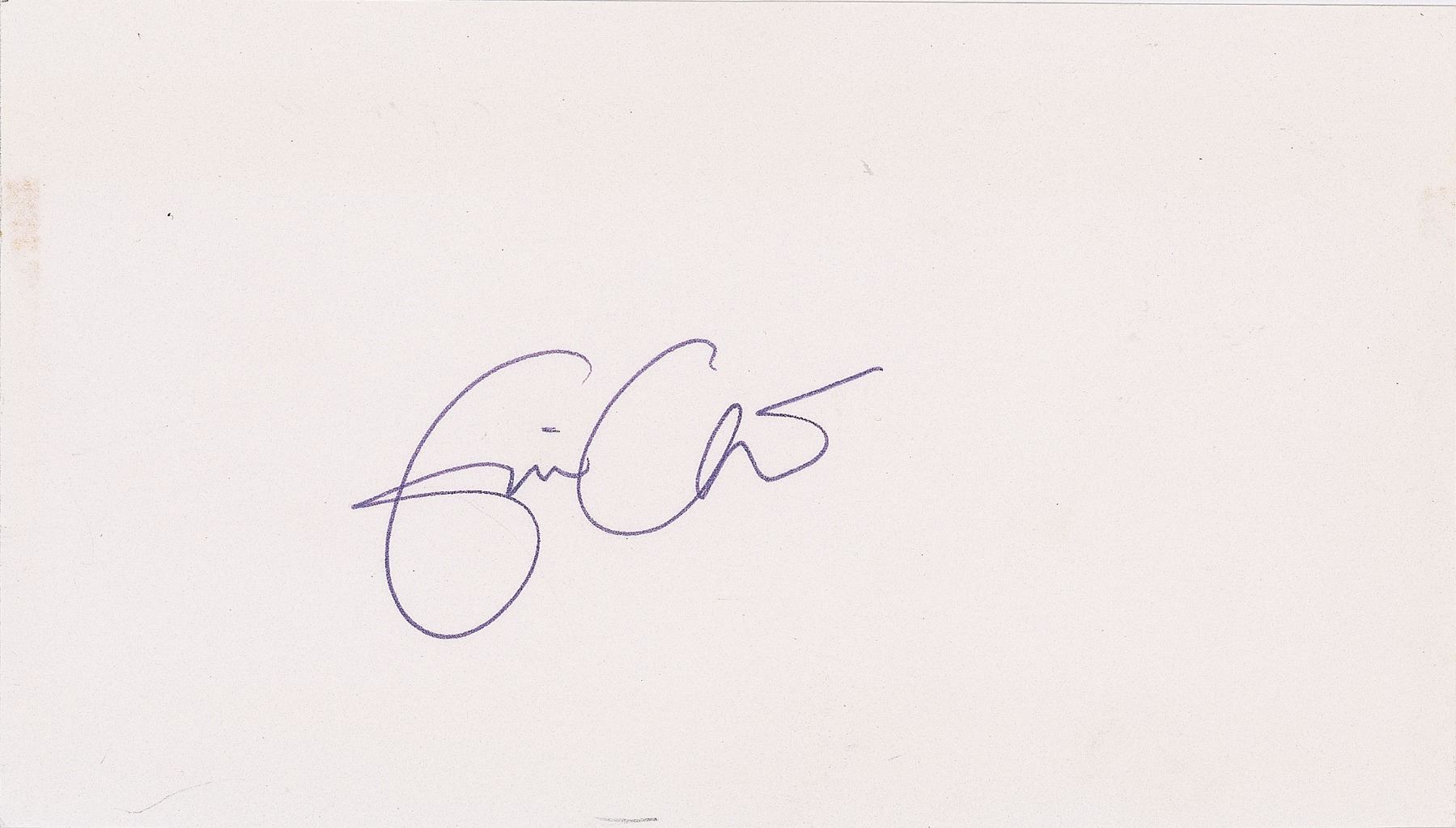 Circa 1994 ink signature, "Eric Clapton,” on an off-white 5.75 x 3.25 card. In fine condition. The consignor notes that the signature was obtained at a 1994 gig that featured Eric Clapton performing with Chicken Shack's Stan Webb; accompanied by a color satin-finish 10 x 8 photo of Clapton and Webb side-by-side with their guitars, as well as a ballpoint signature, "Best Wishes, Stan Webb, October '94," on an off-white 3.25 x 3.25 card.