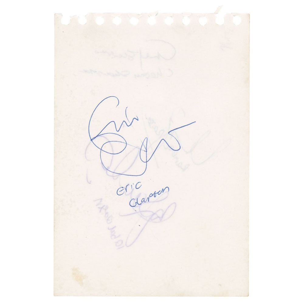 Ballpoint signature, "Eric Clapton,†on an off-white 3.75 x 5.5 autograph page. In fine condition, with show-through from three cricket-related signatures on the back.