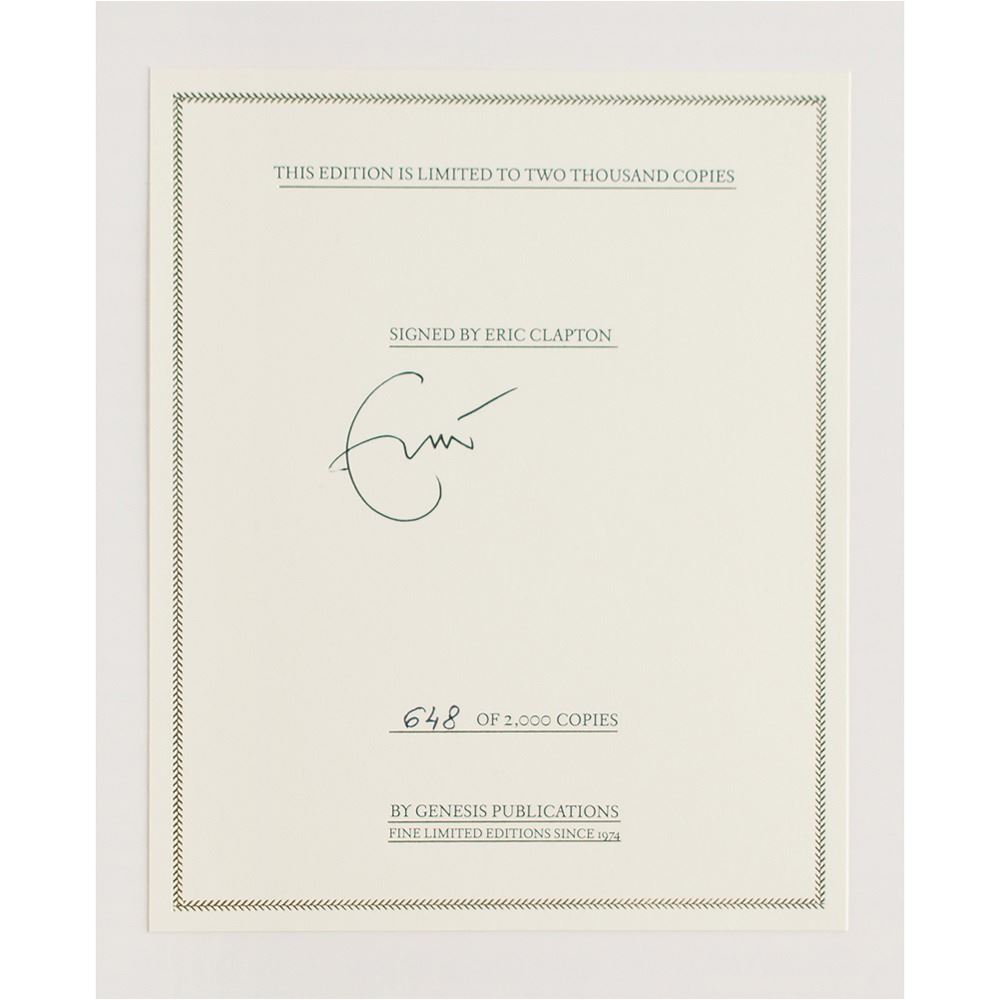 Signed book: Six String Stories: The Crossroads Guitars. Limited edition, numbered 648/2000. Guildford, England: Genesis Publications, 2012. Hardcover with slipcase, 10.25 x 13.5, 376 pages. Signed on the affixed colophon in black ink by Eric Clapton. In very fine condition. Includes its cloth drawstring bag.