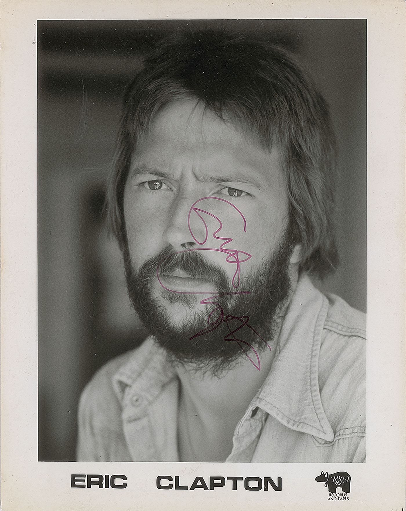 Vintage glossy 8 x 10 RSO publicity photo of a bearded Clapton from the 1970s, signed in purple felt tip. In fine condition, with faint creases to trimmed bottom edge. Accompanied by a full letter of authenticity from JSA. Signed photos of Clapton from the 70s are extremely scarce.