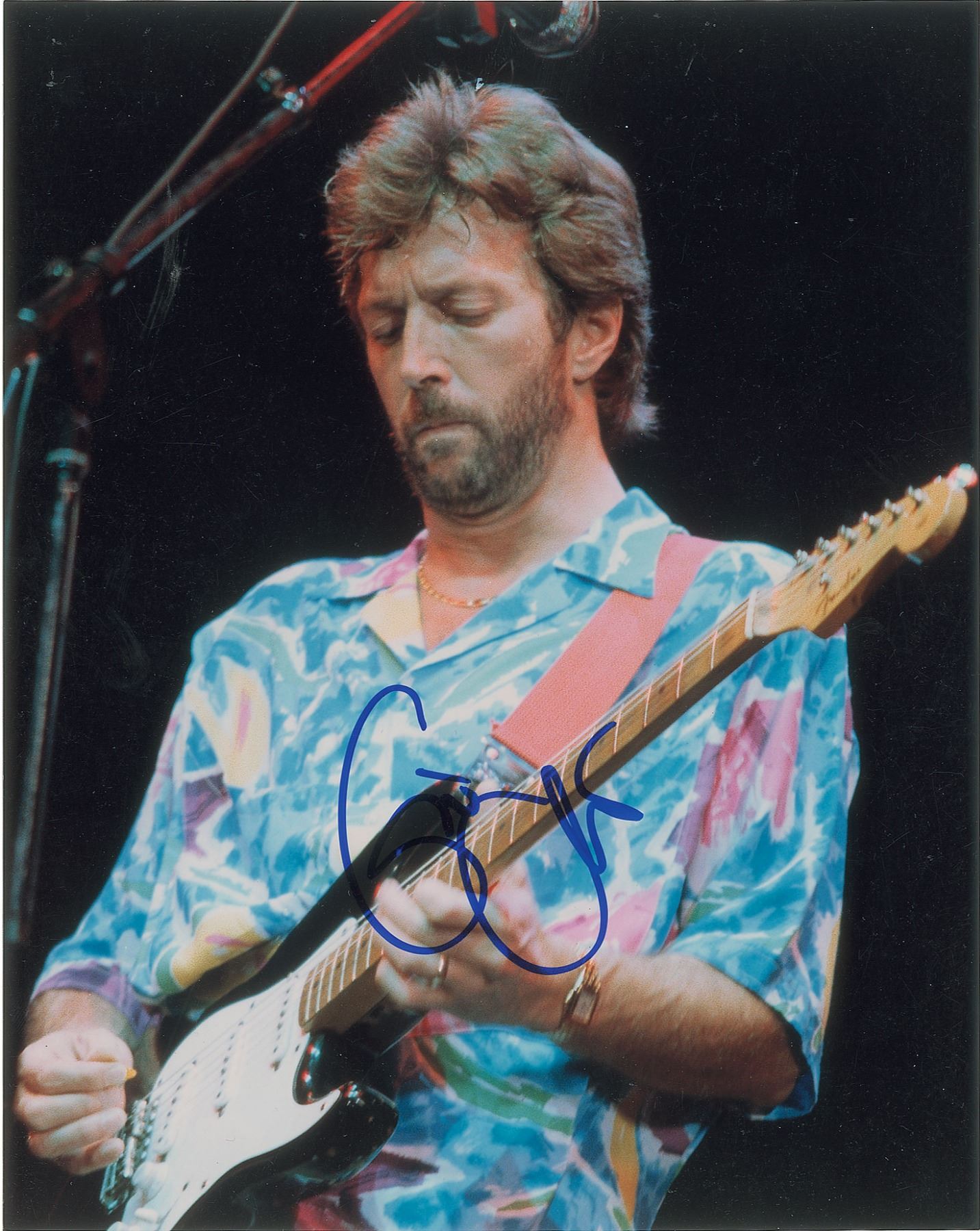 Color glossy 8 x 10 half-length photo of Clapton wearing a colorful shirt and playing the guitar during a live performance, signed in blue felt tip. In fine condition.