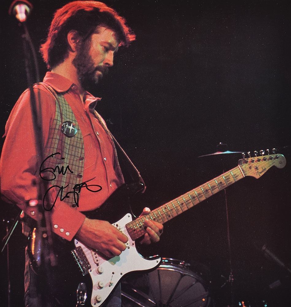 Color semi-glossy 11.5 x 12 book photo of Eric Clapton playing 'Blackie,' his favorite Fender Stratocaster, during a live performance, signed in black felt tip. In fine condition, with light handling wear.
