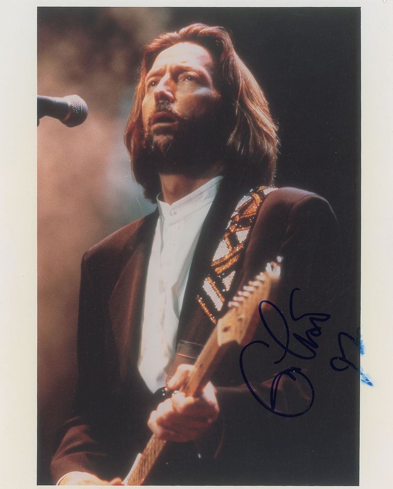 Desirable color glossy 8 x 10 photo of Clapton during a concert, signed in blue felt tip and dated 1992. In fine condition, with moderate signature contrast and a smudge to the bottom of the date. Consignor notes that he obtained this in person in Pittsburgh during Clapton's famous Tears in Heaven Tour.