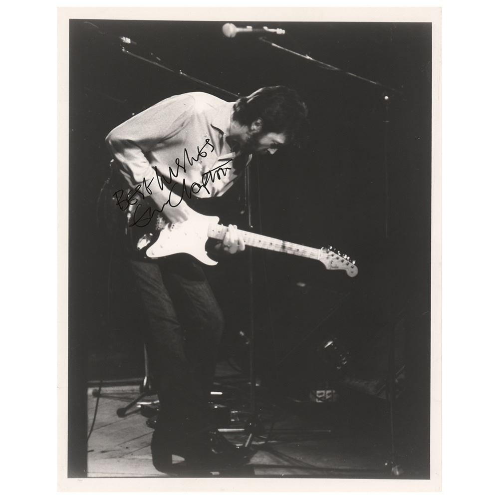 Satin-finish 8 x 10 full-length photo of Clapton playing his favorite Fender Stratocaster during a live performance, signed in black ink, "Best wishes, Eric Clapton." In fine condition, with poor contrast to Clapton's first name and a few small creases.