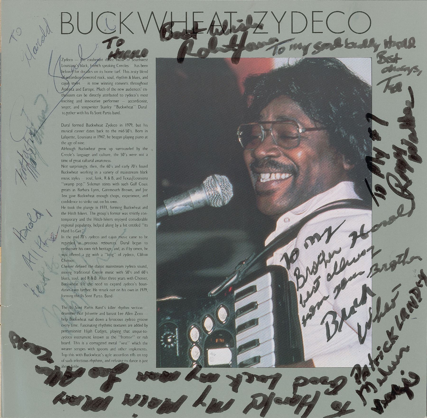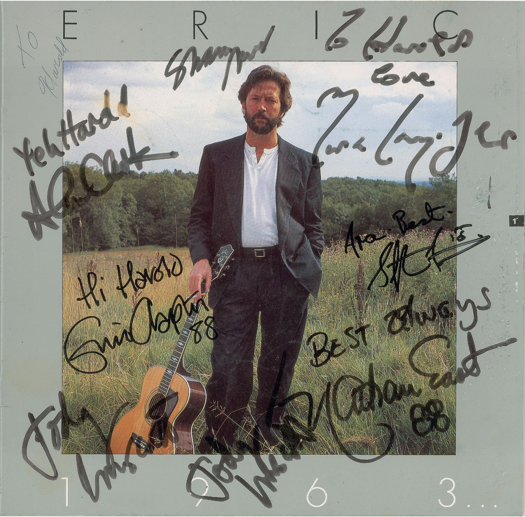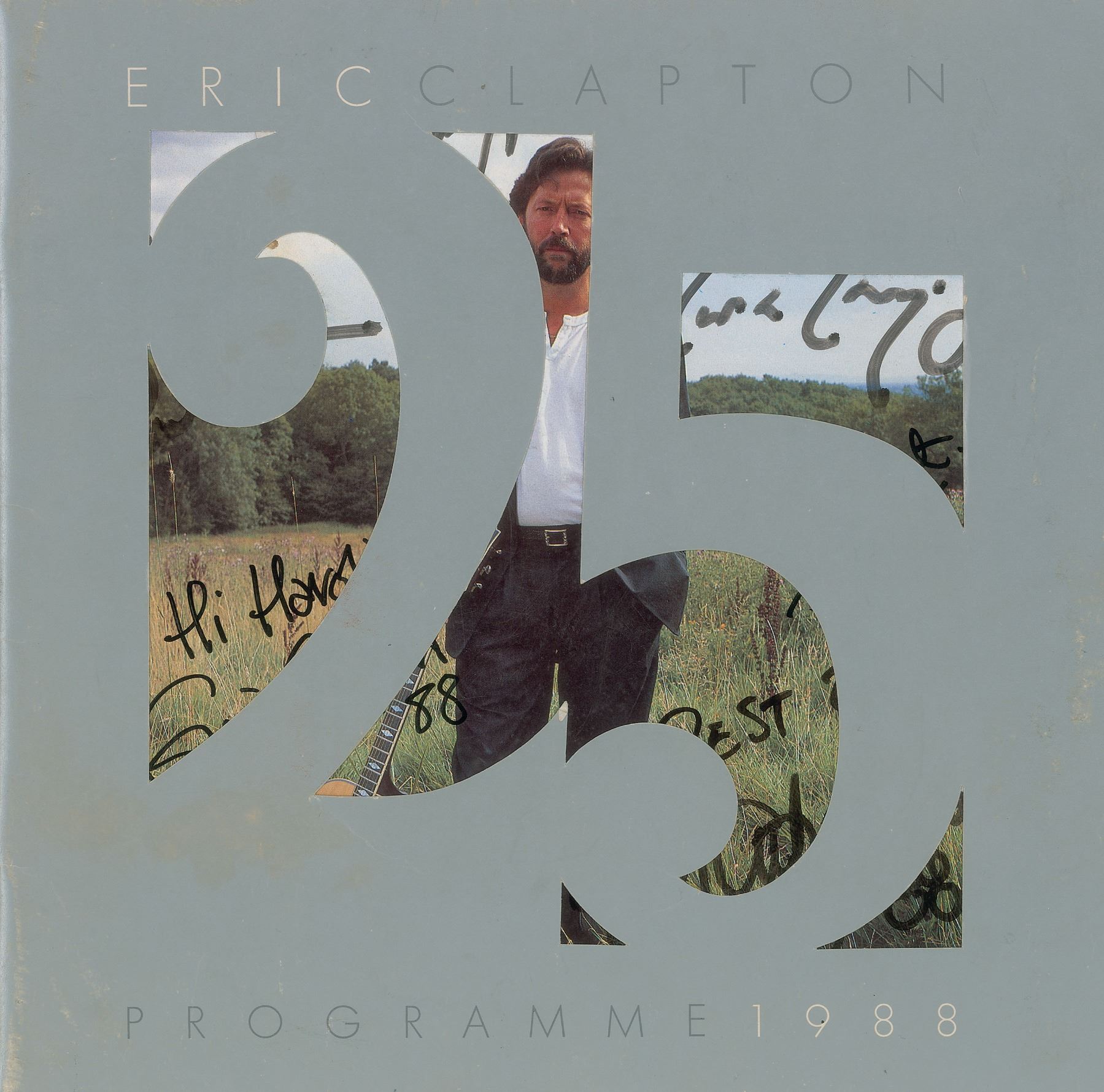 Desirable program from Eric Clapton's 25th Anniversary Tour in 1988, 36 pages, 11 x 10.75, signed on the first page in black felt tip by Clapton (signing with an unusually legible full name), as well as by band members Mark Knopfler, Alan Clark, Steve Ferronne, Nathan East, and more, with many adding inscriptions to "Harold"; also signed on the last page by legendary accordionist and zydeco musician Buckwheat Zydeco, along with others. In fine condition, with some mild scuffing, light creasing to the cover, and a light stain to the signed page.