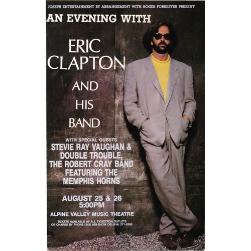 <B>Eric Clapton/Stevie Ray Vaughan Alpine Valley Music Center Concert Poster (1990).</B></I> This poster originally advertised the very last concert appearances by Texas legend Stevie Ray Vaughan. It was an all-blues event, headlined by Eric Clapton, featuring performances by the Robert Cray Band and Buddy Guy. After the final show, a helicopter whisked Stevie Ray away to his doom. A great show, with a very sad ending! The poster measures approximately 14" x 22", and appears to our eyes to be an authentic first printing. It's in NM condition.<BR><BR><b>Shipping:</b> Flat Material, Small (<a target="_blank" href="http://www.heritageauctions.com/common/shipping.php">view shipping information</a>)
