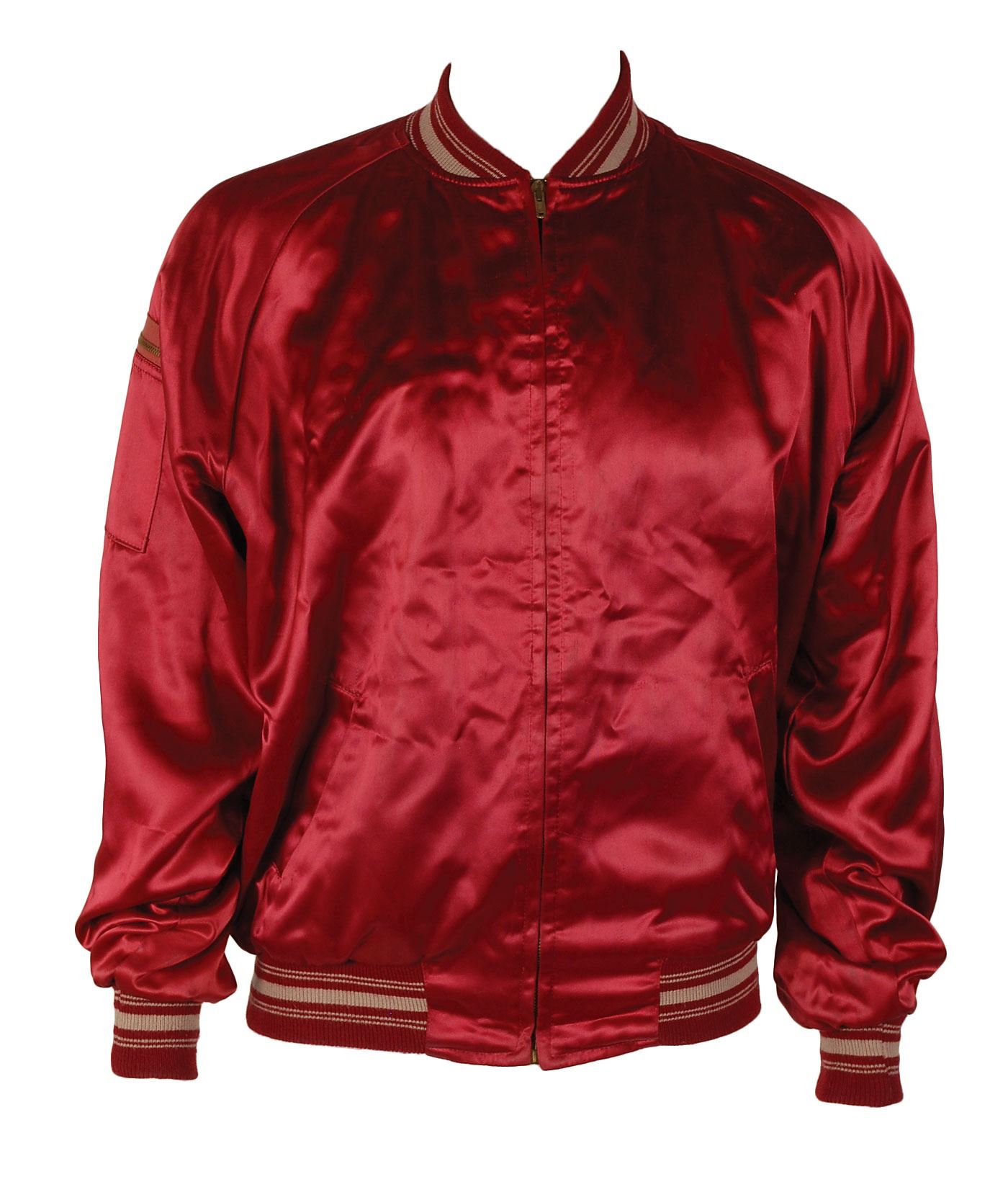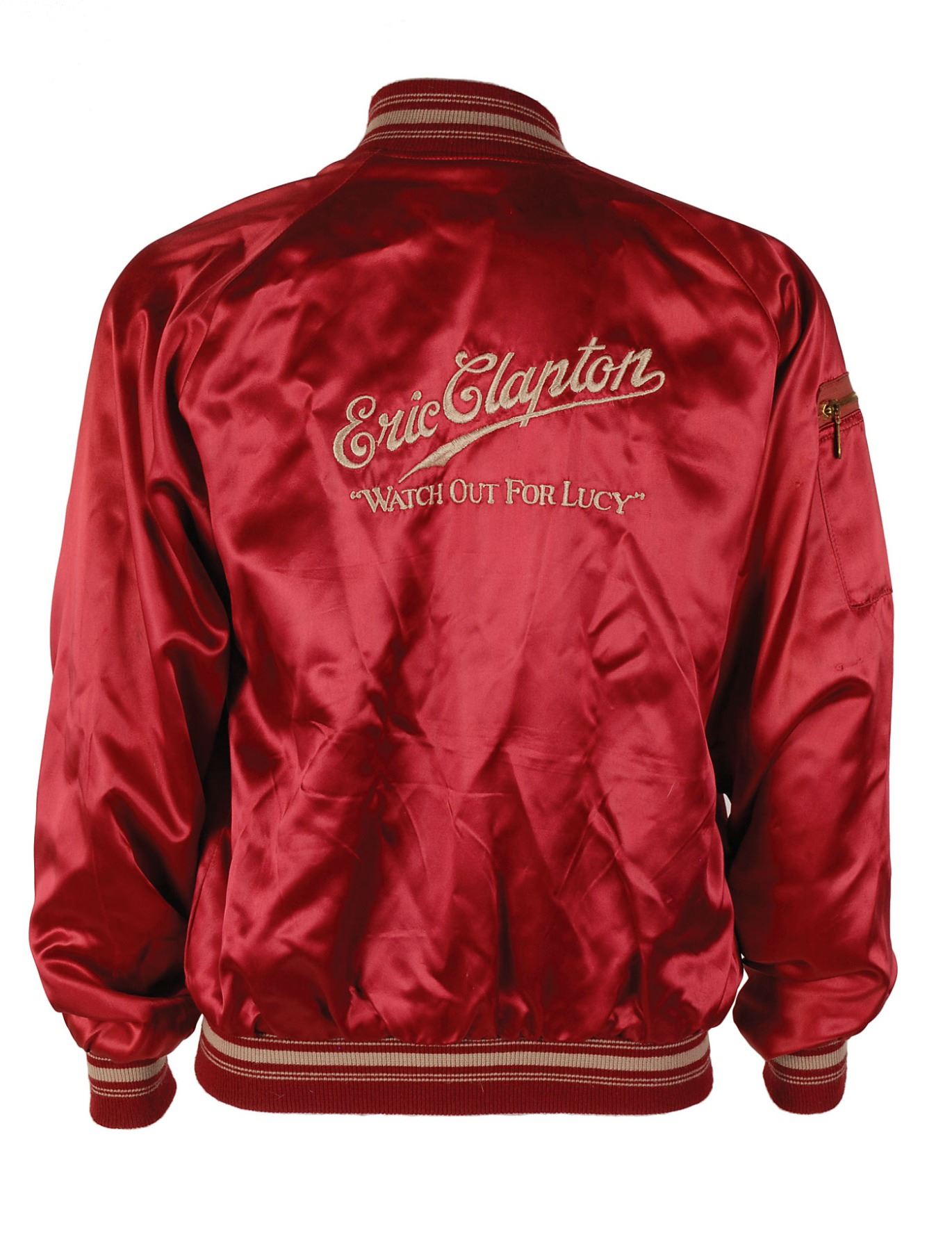 Dark red satin tour jacket, size large, embroidered on the back with gold thread, "Eric Clapton, 'Watch Out For Lucy.'" A Girard & Mandel manufacturer's tag is sewn inside the collar area. In fine condition.