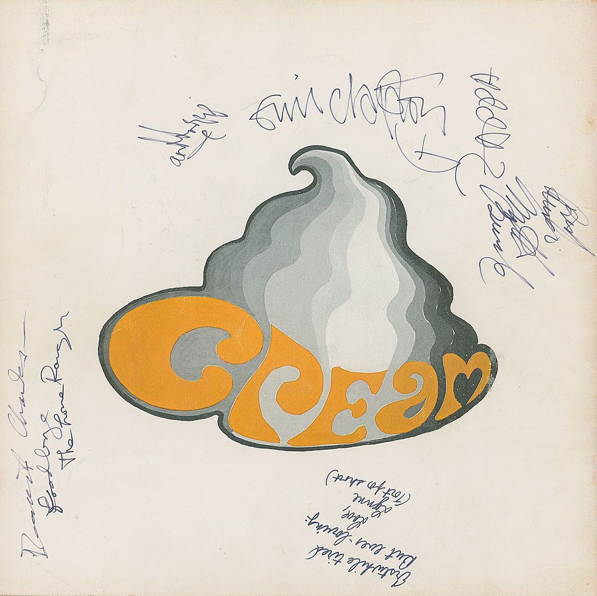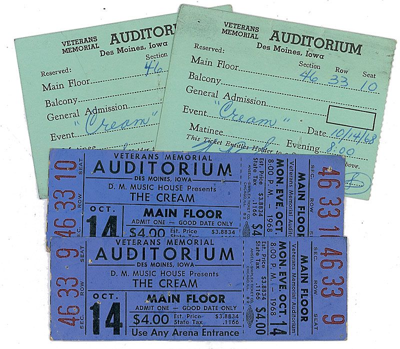 Program for Cream’s 1968 US tour, 12 x 12, featuring numerous images of the band inside, signed on the back cover in black felt tip by Eric Clapton, Frank Zappa, and four others. Scattered surface creases, and some light rubbing and soiling, otherwise fine condition. Accompanied by two sets of tickets to the Cream concert at Veterans Memorial Stadium in Des Moines, Iowa, on October 14, 1968.