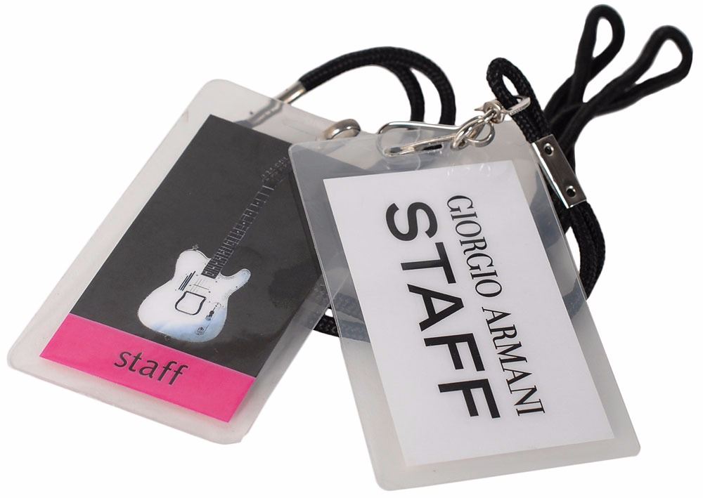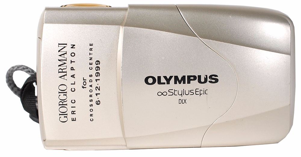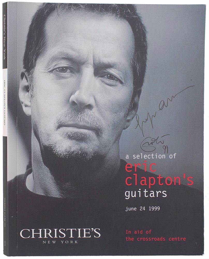 A Selection of Eric Clapton's Guitars auction catalog for June 24, 1999, held by Christie's of New York in aid of the Crossroads Center, 8.25 x 10.5, 195 pages, signed on the front cover in black ink, "Eric Clapton, 99" and "Giorgio Armani." In fine condition. Accompanied by three items from the aforesaid event: a limited edition Olympus Stylus Epic DLX camera, and a pair of laminated staff passes.