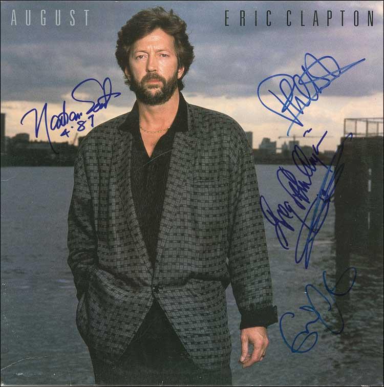 August album signed on the front cover in blue felt tip by Clapton as well as three members of his band from the album including Phil Collins, Nathan East, and Greg Phillinganes. In fine condition, with a couple mild creases. The record is included. Pre-certified Roger Epperson/REAL and RRAuction COA.